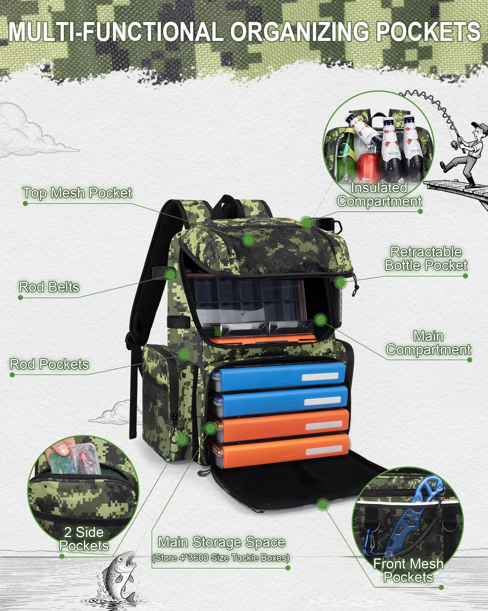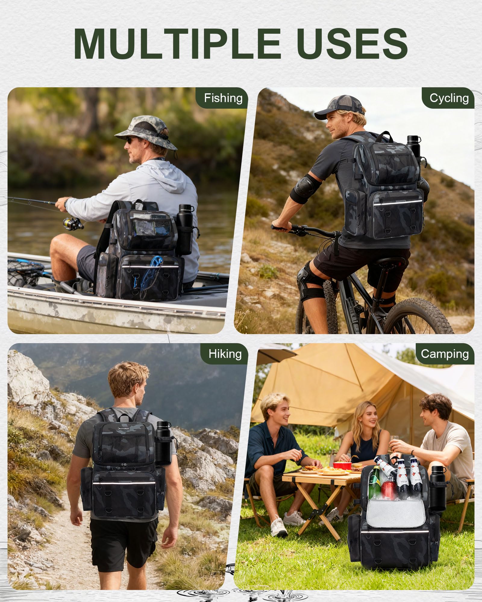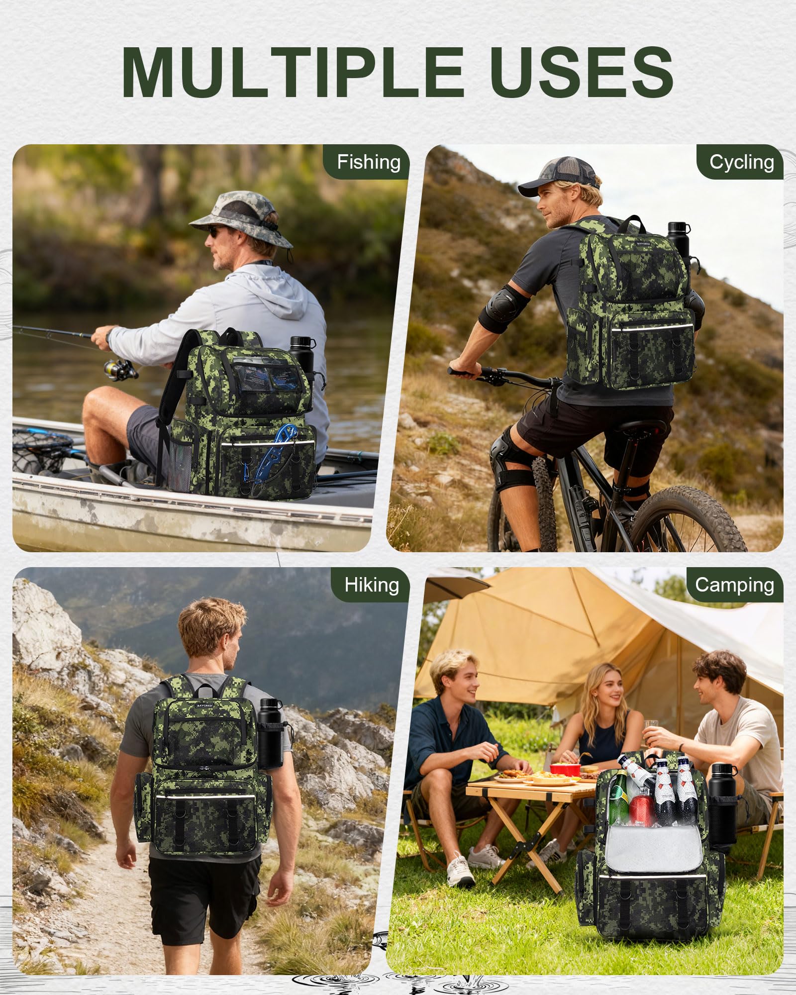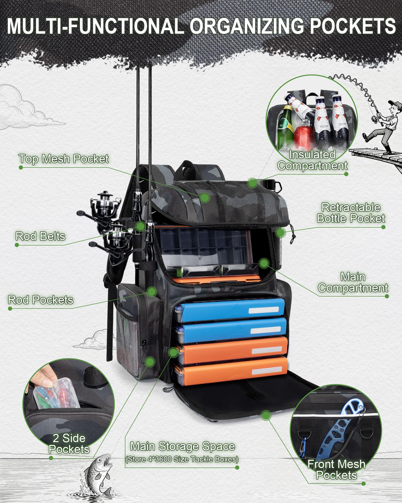 - MULTIPLE STORAGE SPACE:This fishing backpack features 14 smartly designed compartments, including a spacious adjustable main compartment, rod holders, wet pockets, and dedicated side pockets. Every pocket is strategically placed for quick access, ensuring rods, tools, and tackle stay organized and within reach