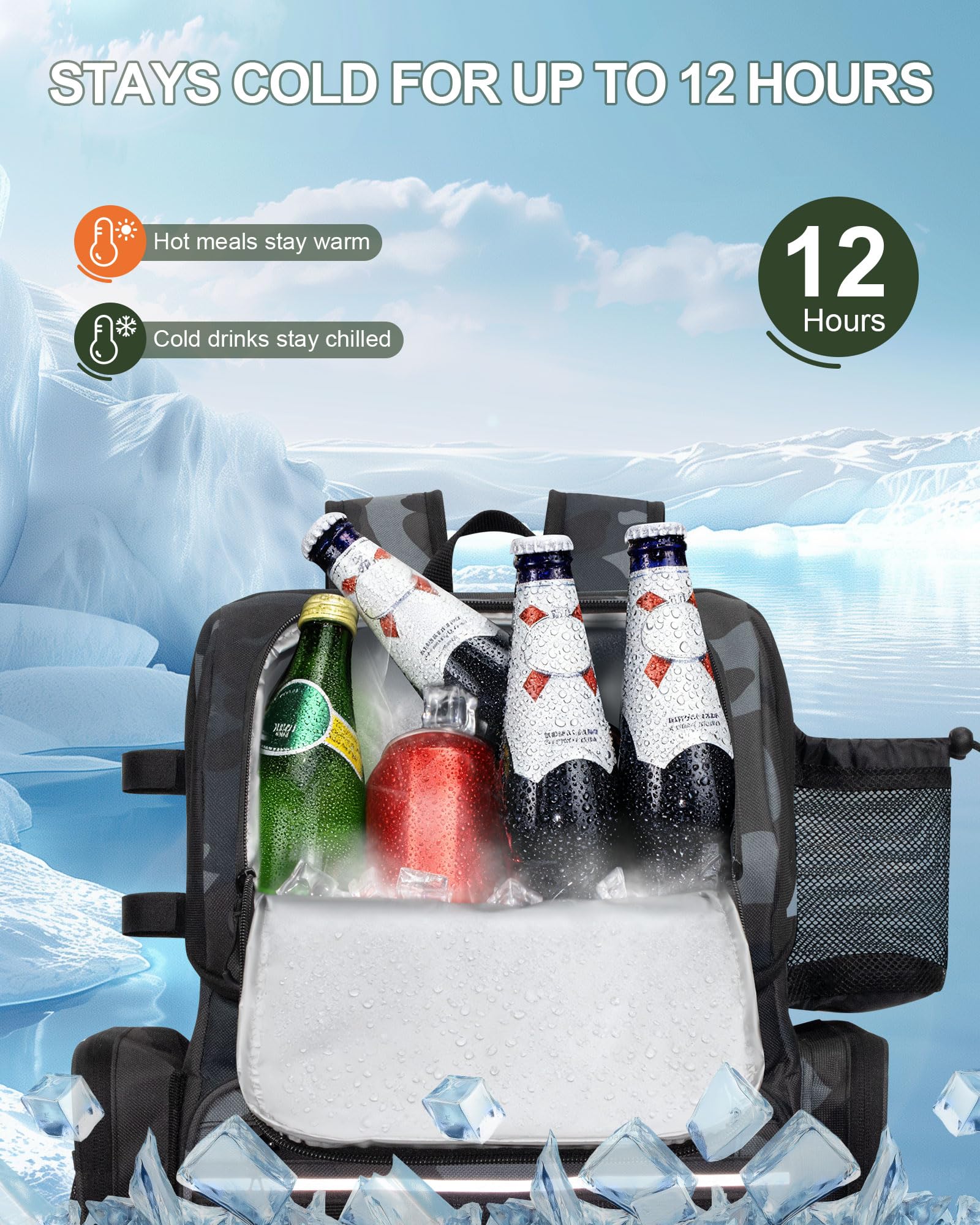 - REFRIGERATION FUNCTION: The fishing gear bag features an integrated cooling compartment, allowing you to store chilled beverages in hot weather. Adding ice packs enhances the cooling effect. The insulated layer helps maintain optimal temperatures, ensuring outdoor food stays fresh and safe
