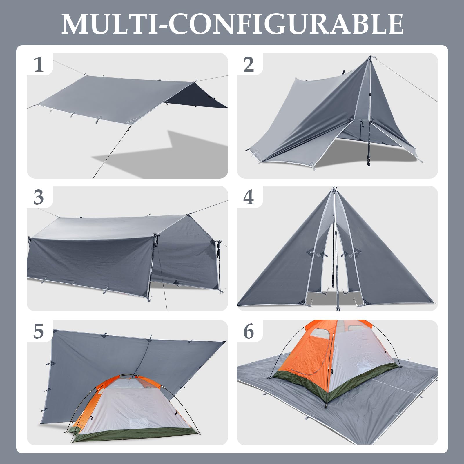 - [DURABLE AND STURDY]:The camping tarp tent features reinforced ridge seam stitching and tear-resistant materials with a heavy-duty design,effectively preventing joint separation.It performs fine in continuous stormy weather,offering outstanding protection. Reliable, durable,and safe,it can also be used as a sleeping mat,rain cover,sunshade umbrella,emergency shelter