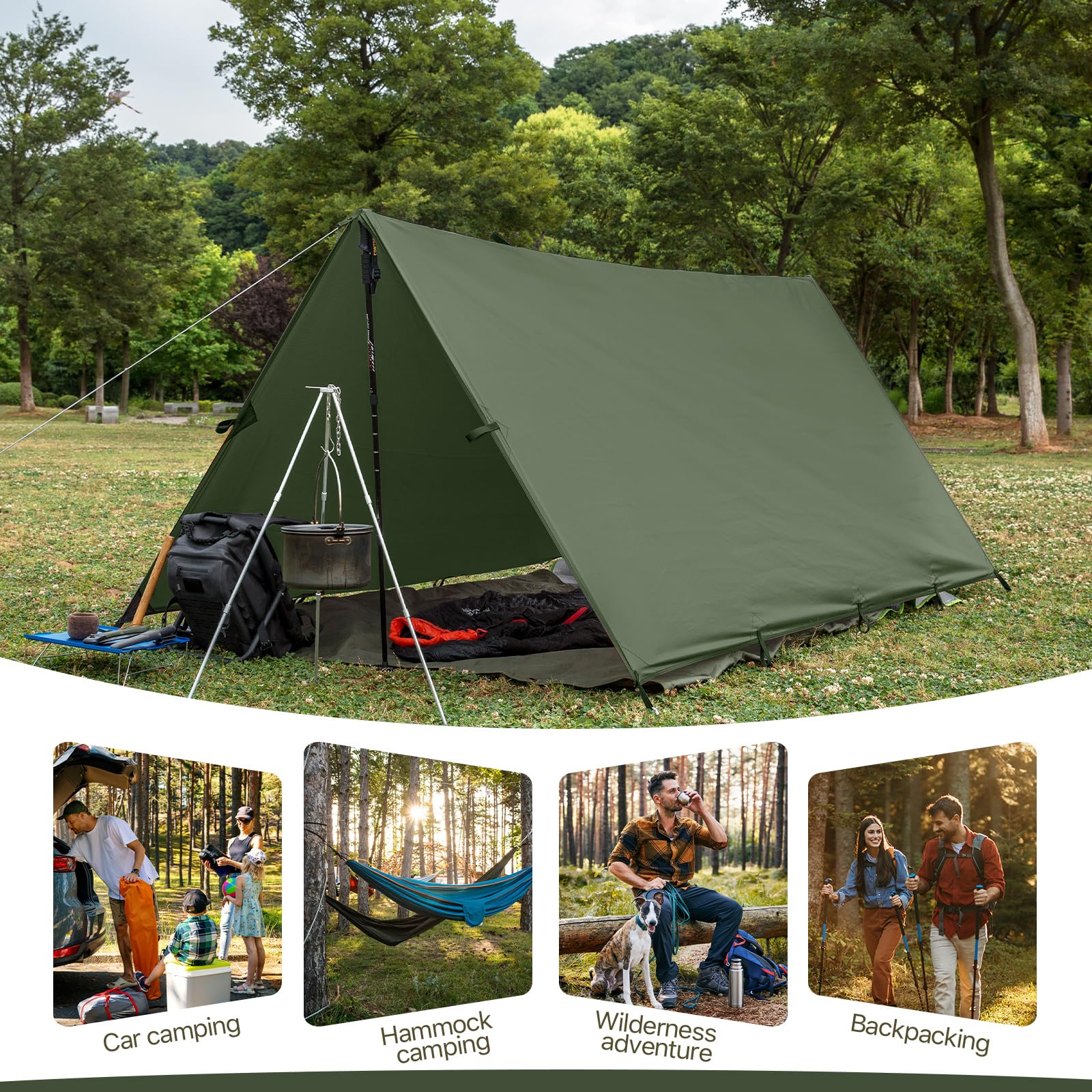 - [WATERPROOF AND UV PROTECTION]:The camping tarp tent is made of 150D abrasion-resistant and tear-resistant plain weave fabric,with a waterproof rating of 3000PU.It features professional waterproof adhesive seam materials,enhancing its waterproof,windproof,and snowproof functionality for all four seasons.The tightly reinforced stitching ensures no water leakage.The camping tarp tent can also be used as a sunshade,effectively blocking ultraviolet rays and protecting the skin