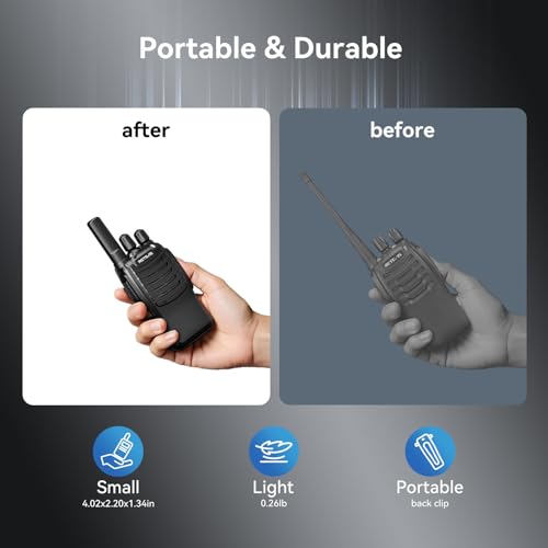 - 【Lightweight Walkie-Talkie】ergonomic 4.02x2.20x1.34inch; ultra-light 0.26lb; short antenna prevents snagging and easy to grip; suitable for restaurant waiters during busy dining peak hours