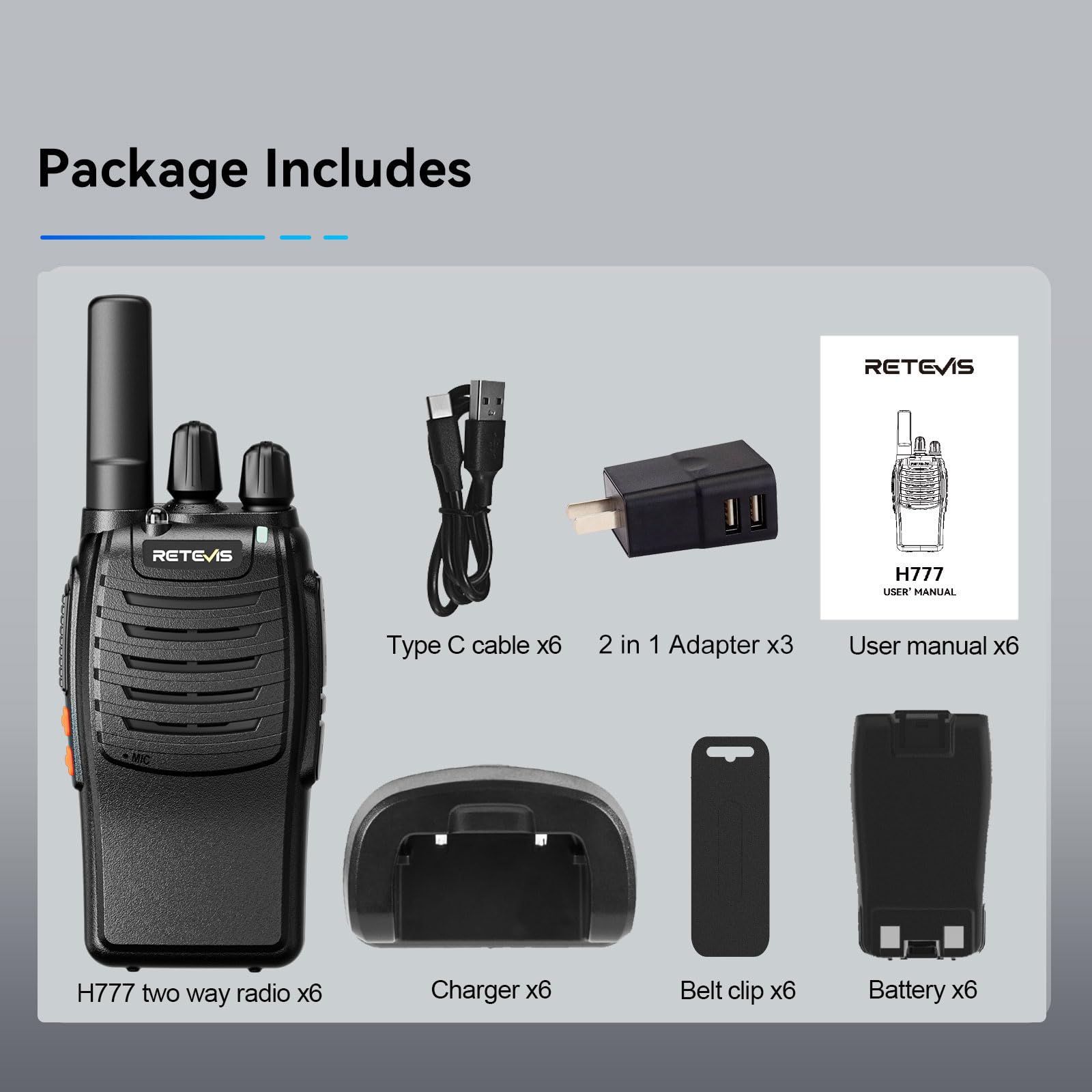 Case of 6,Retevis H-777 Walkie Talkies for Adults Long Range, Rechargeable Two-Way Radios,with 6-Way Multi Unit Charger,Flashlight Handheld Business 2 Way Radios