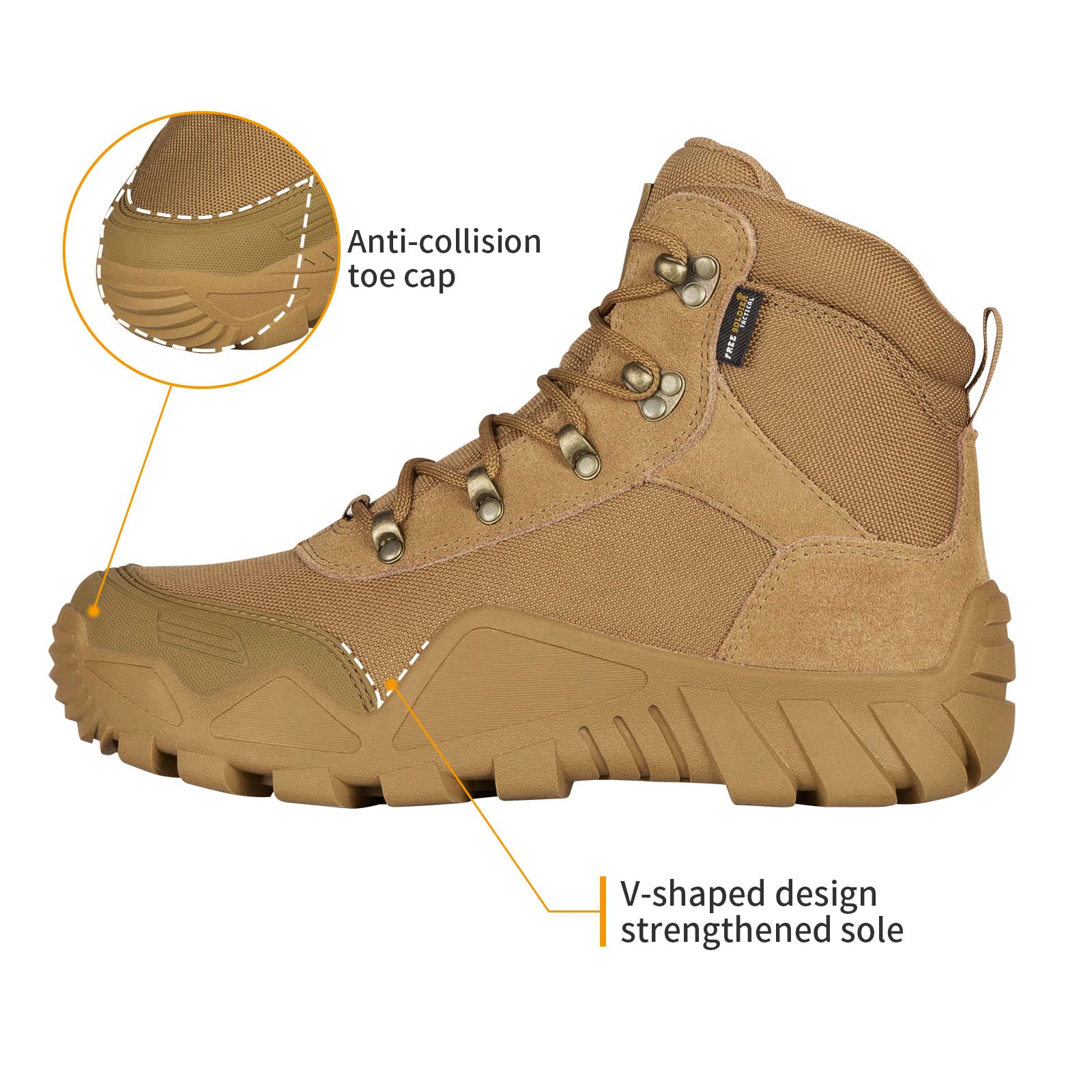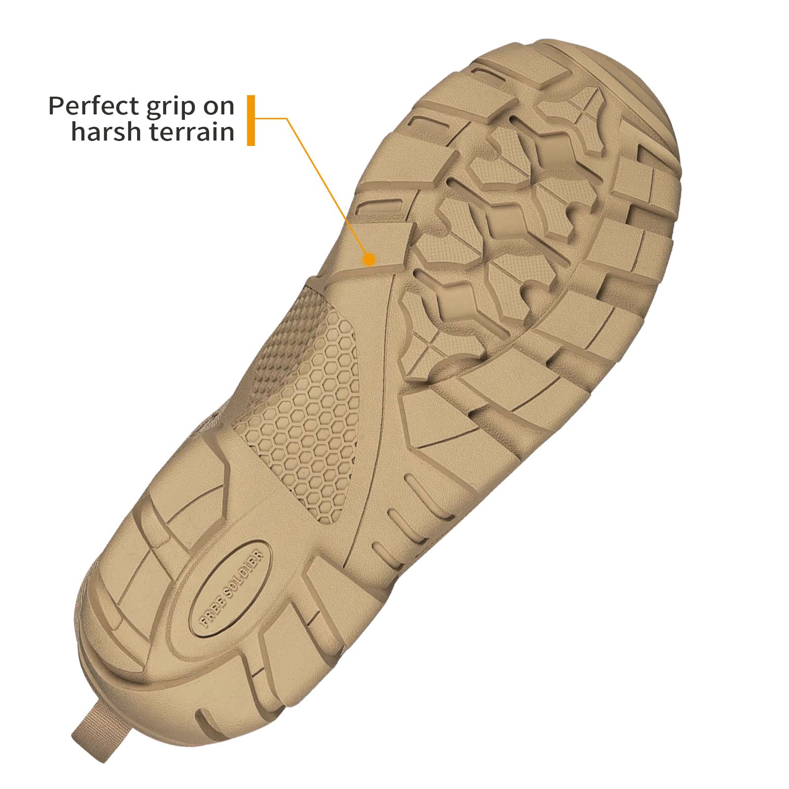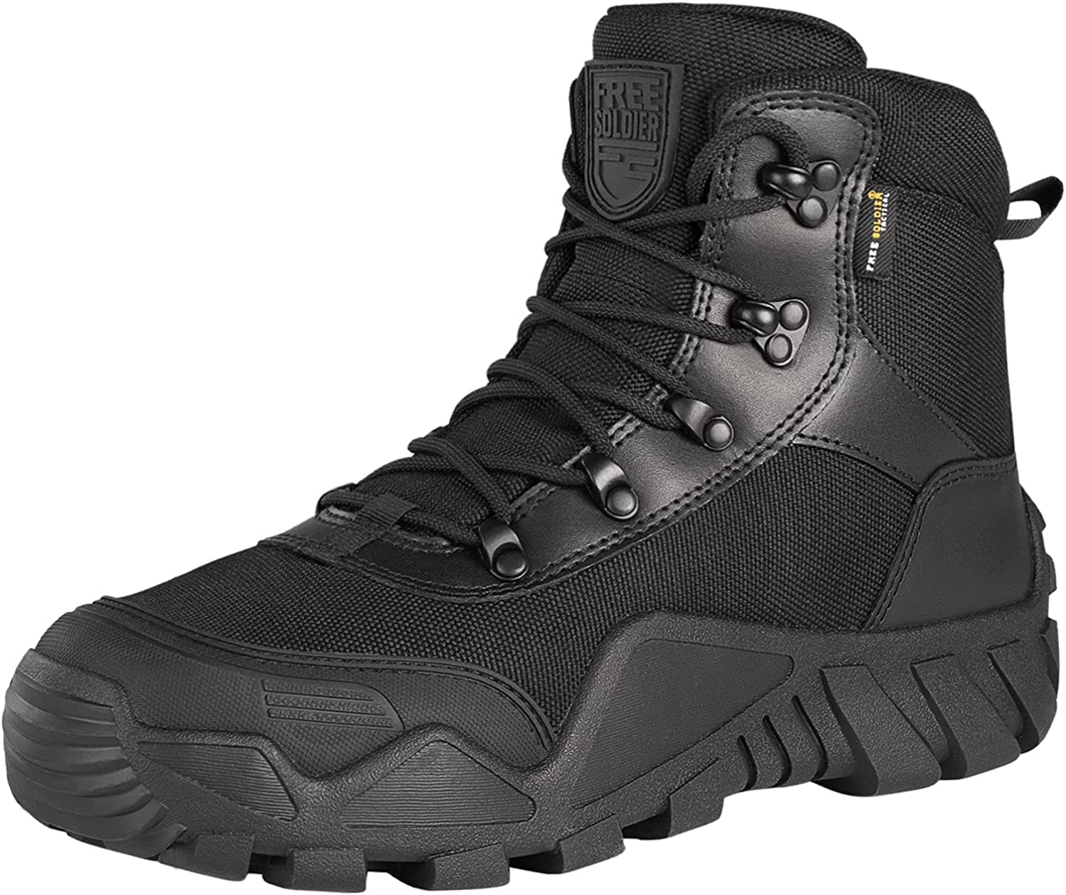 - Durable Construction: Abrasion-resistant nylon material is the major component for the FREE SOLDIER hiking boots uppers with leather as decoration. The tactical shoes outsole is made of thick and sturdy rubber, and the curved outsole edges strengthen uppers' integration with soles, which help enhance the durability of tactical hiking boots.