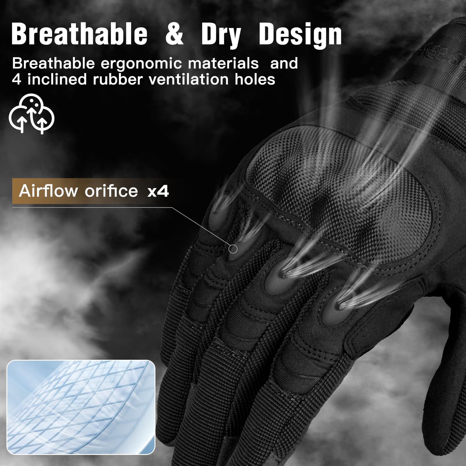 - BREATHABLE & DRY DESIGN Those gloves are made with breathable ergonomic materials and there are 4 inclined rubber ventilation holes at the finger joints to quickly dissipate heat and get rid of sweat faster, wide suitable for outdoor work sports motorcycle cycling airsoft training shooting hunting hiking camping climbing