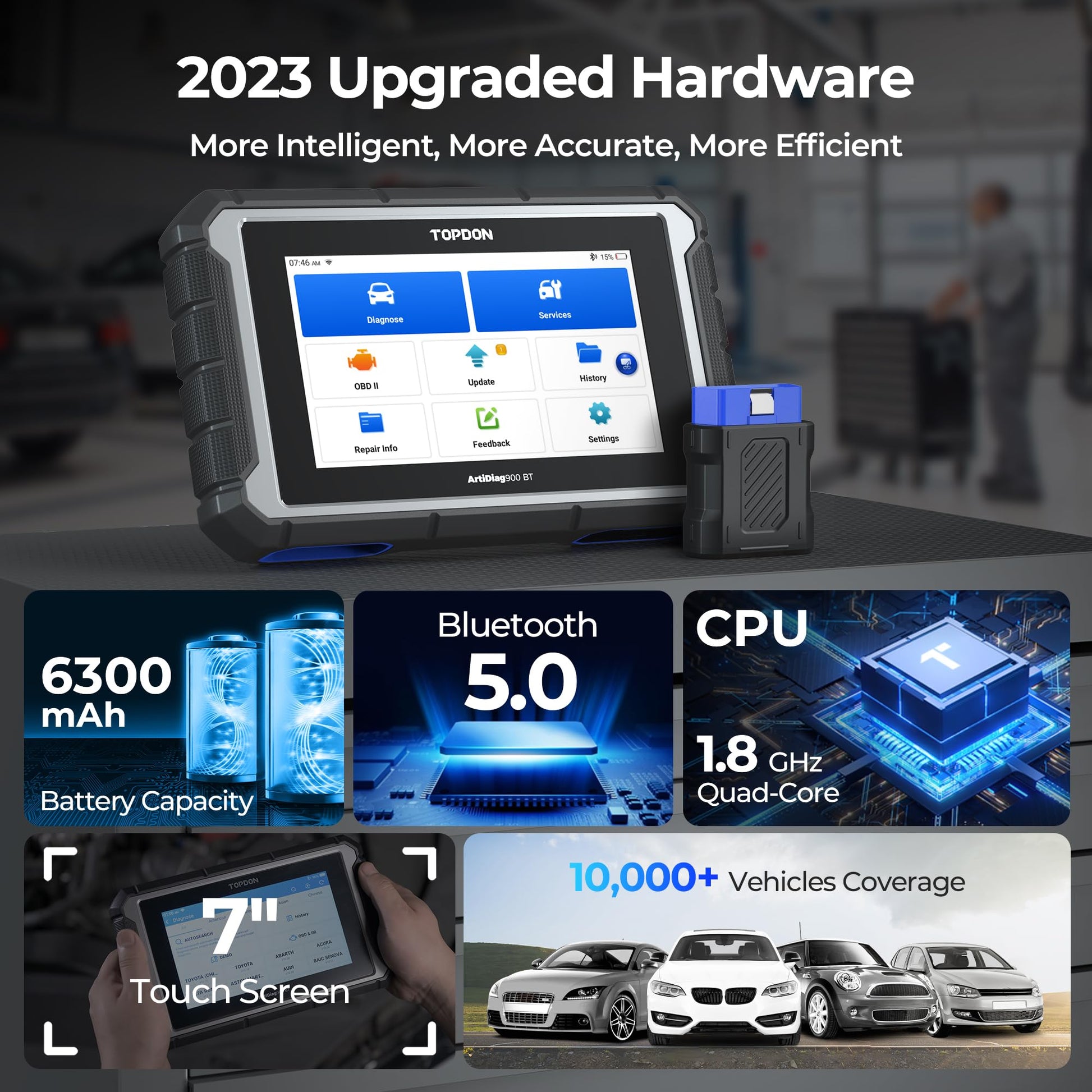 - [2 Years Updates with No Fee + 6300mAH Long Standby] Tired of paying for updates? This OBDII car scanner offers 2 years updates with no fee and one-click updates to enjoy the latest features so you can easily update your scanner tool with just a few clicks. With its upgraded 4-core 1.8Ghz CPU, the ArtiDiag900 BT runs faster and more efficiently, delivering a seamless user experience. With its 7-inch screen, it always displays clear diagnostic results. In addition, The car code reader is equipped with a 6300mAh battery that provides up to 11 hours of screen time, making it the ideal tool for on-the-go automotive diagnostics.