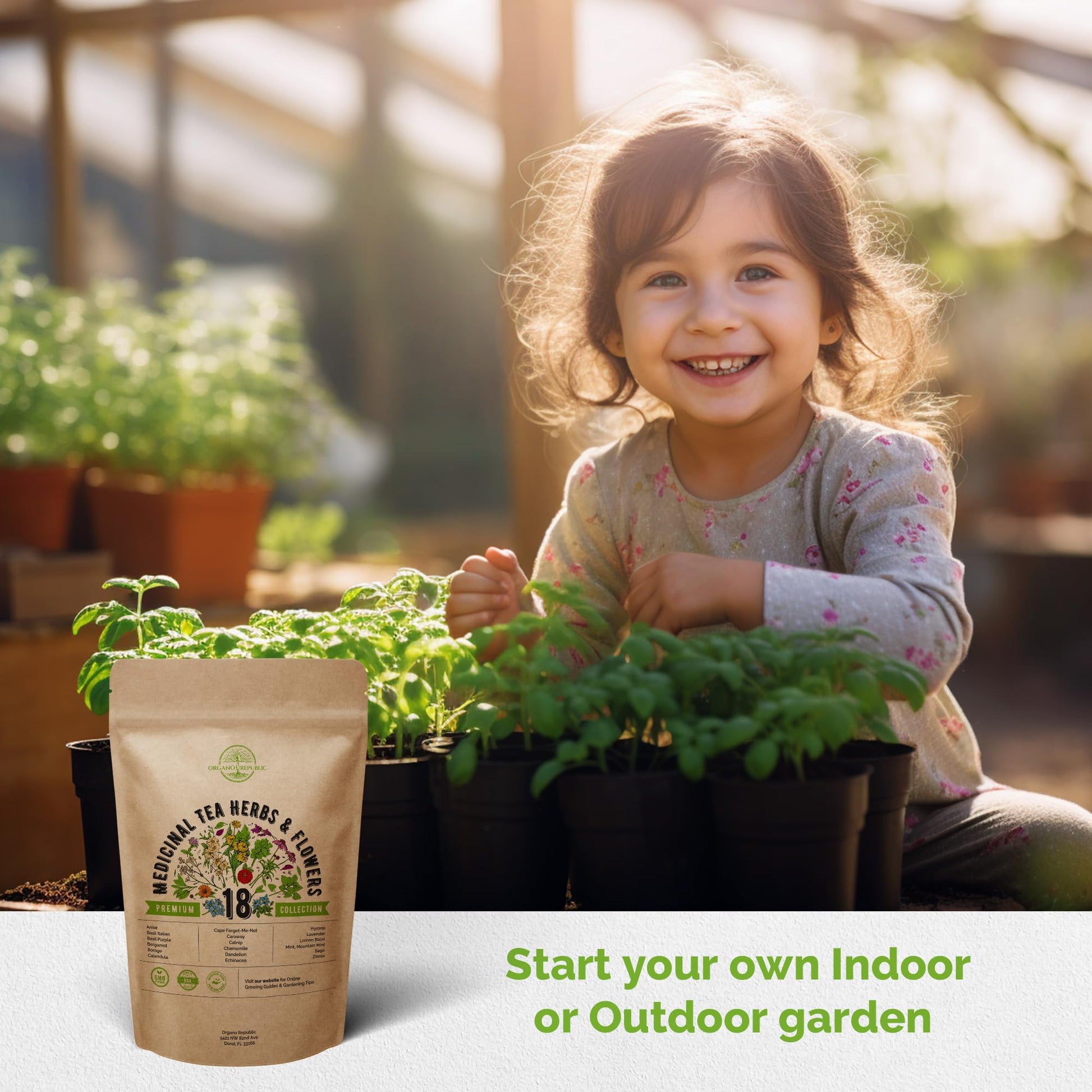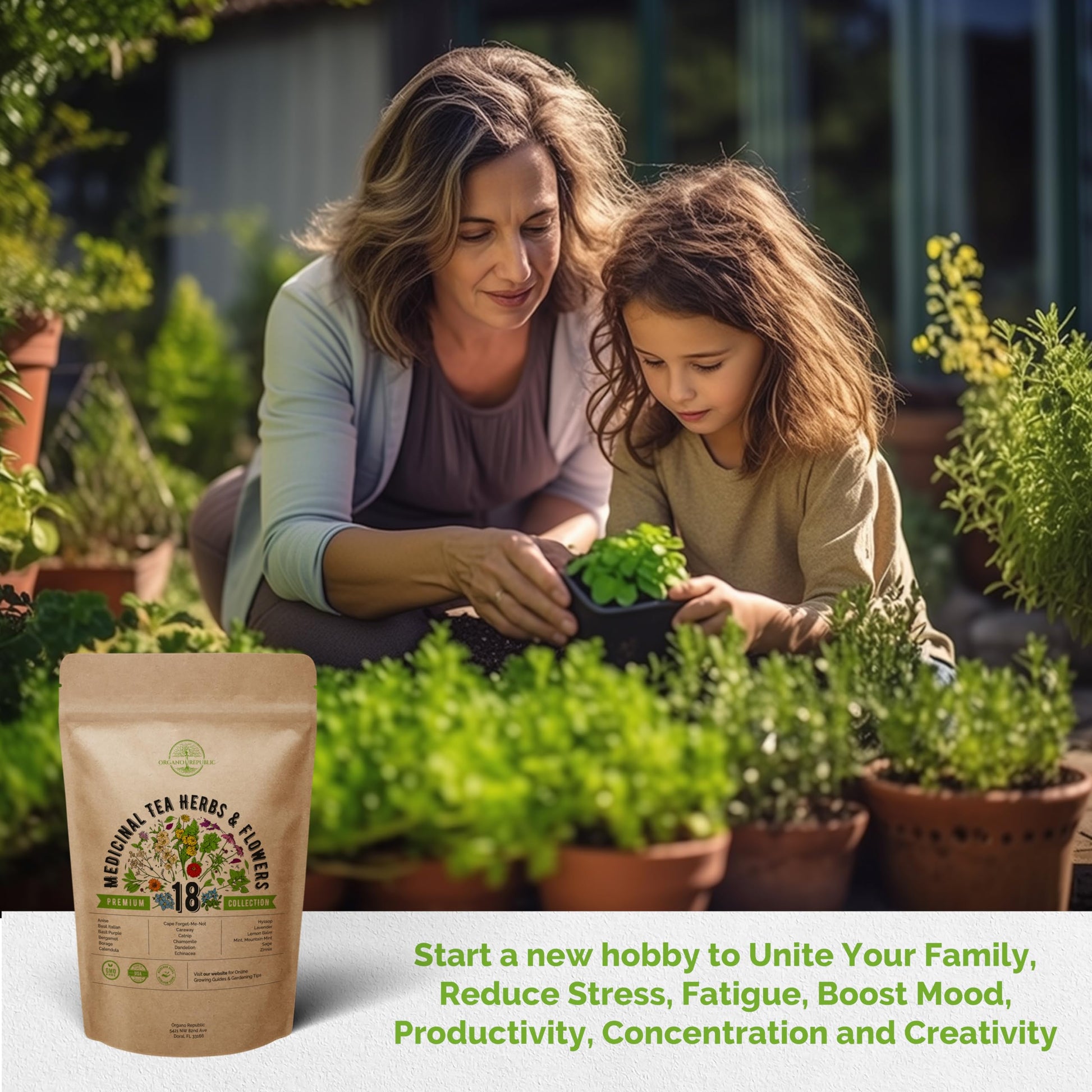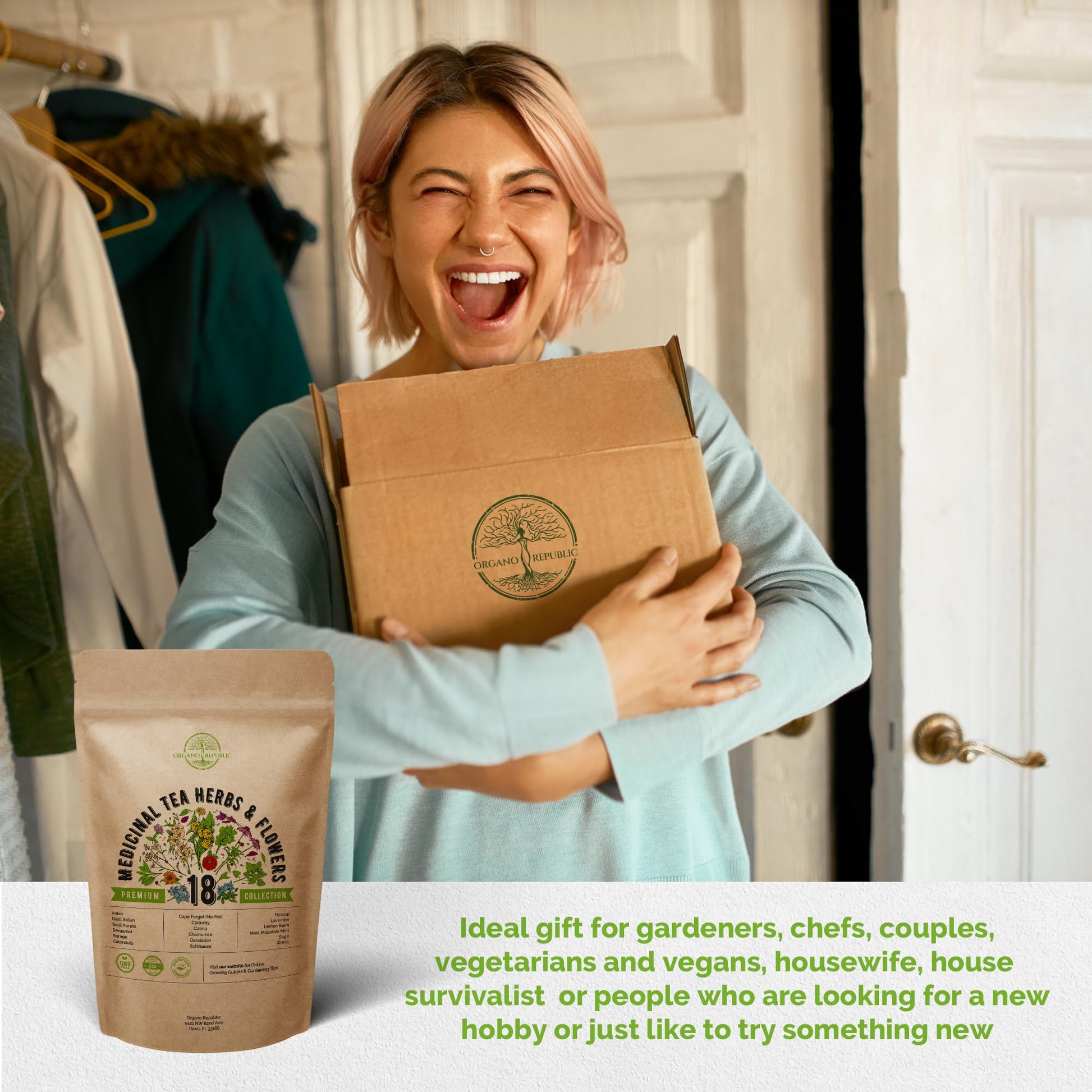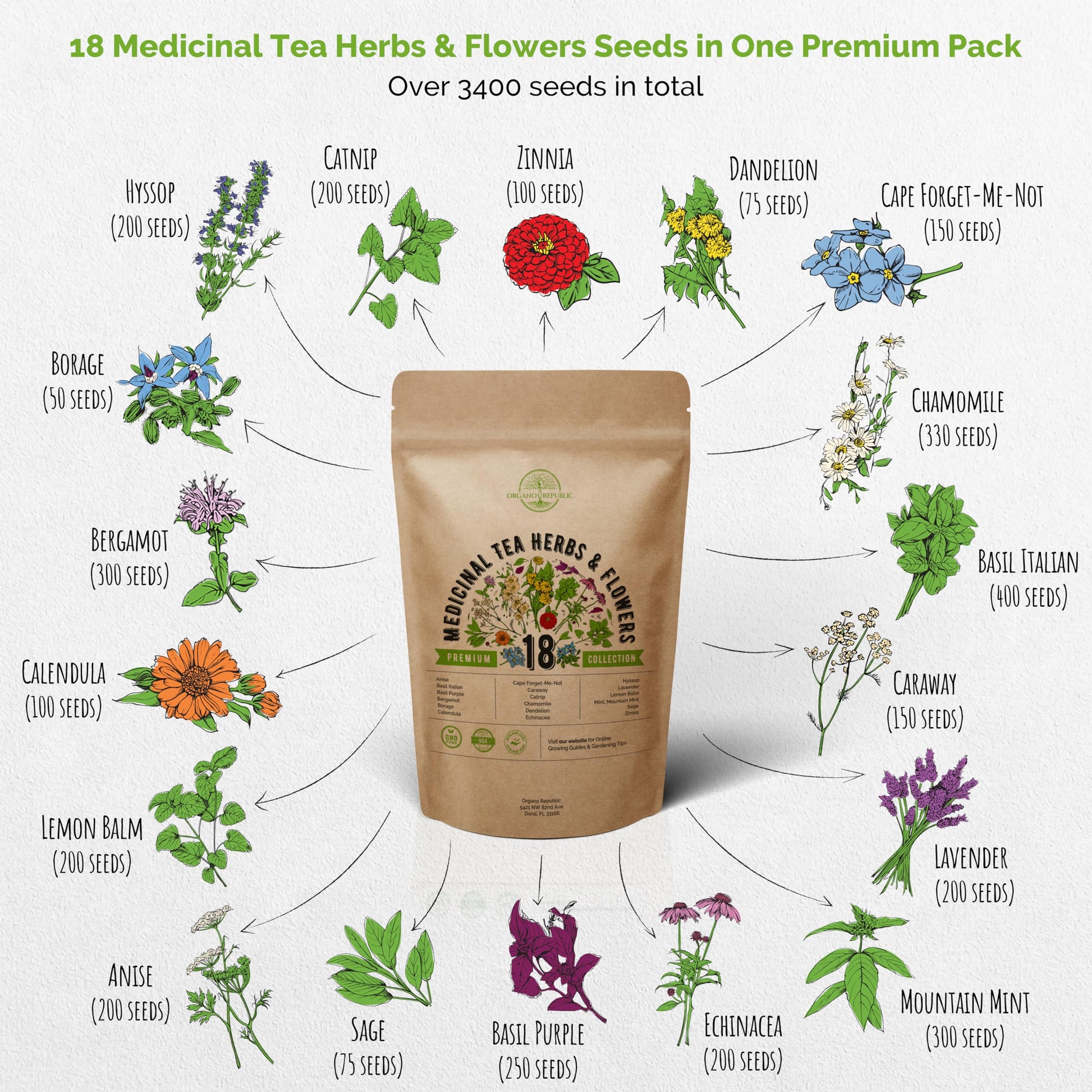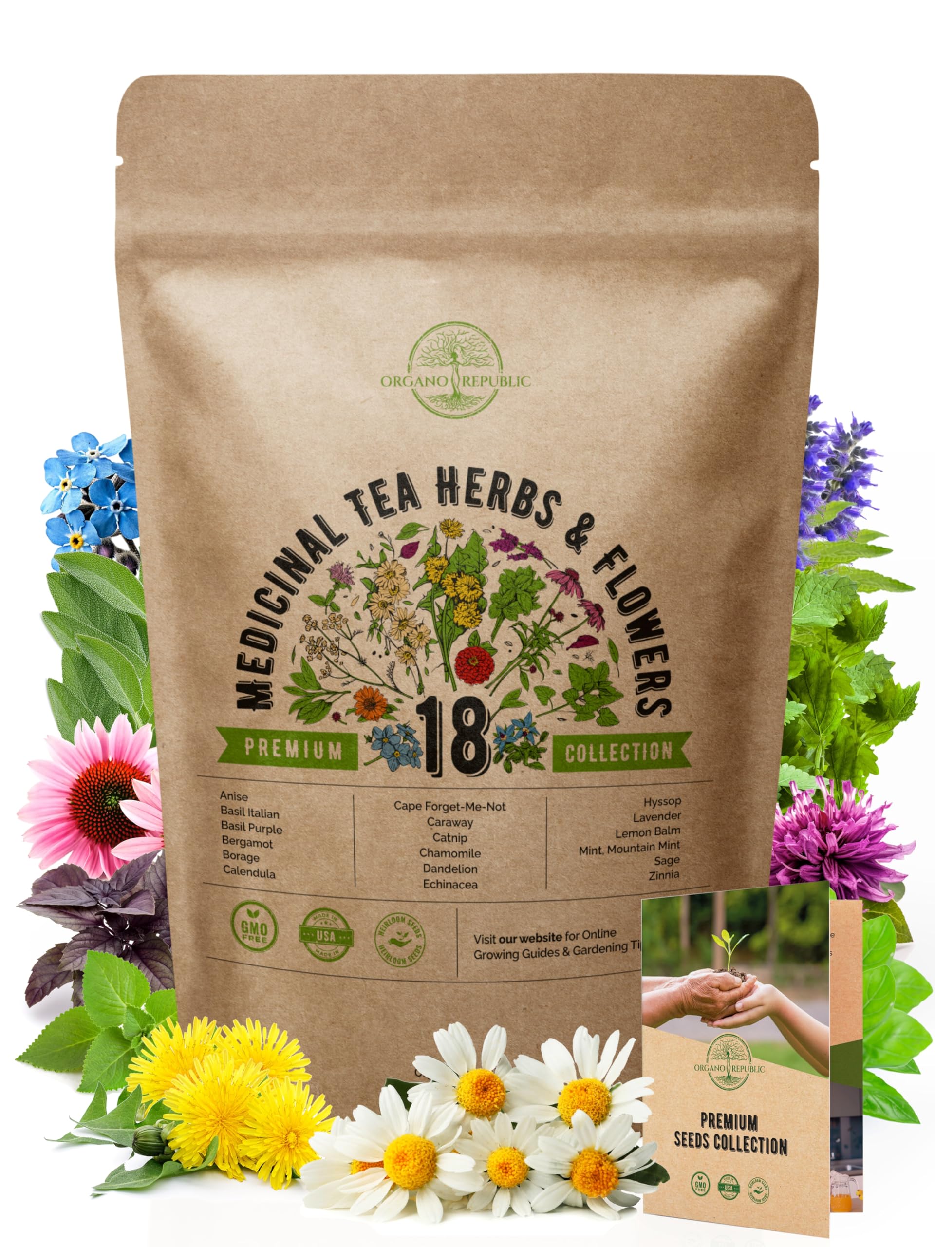 Organo Republic 18 Medicinal Tea Herb & Flower Seeds Variety Pack- Indoor/Outdoor. 3400+ Non-GMO Heirloom Flower Seeds: Anise, Bergamot, Calendula, Chamomile, Echinacea, Lavender Seeds & More
