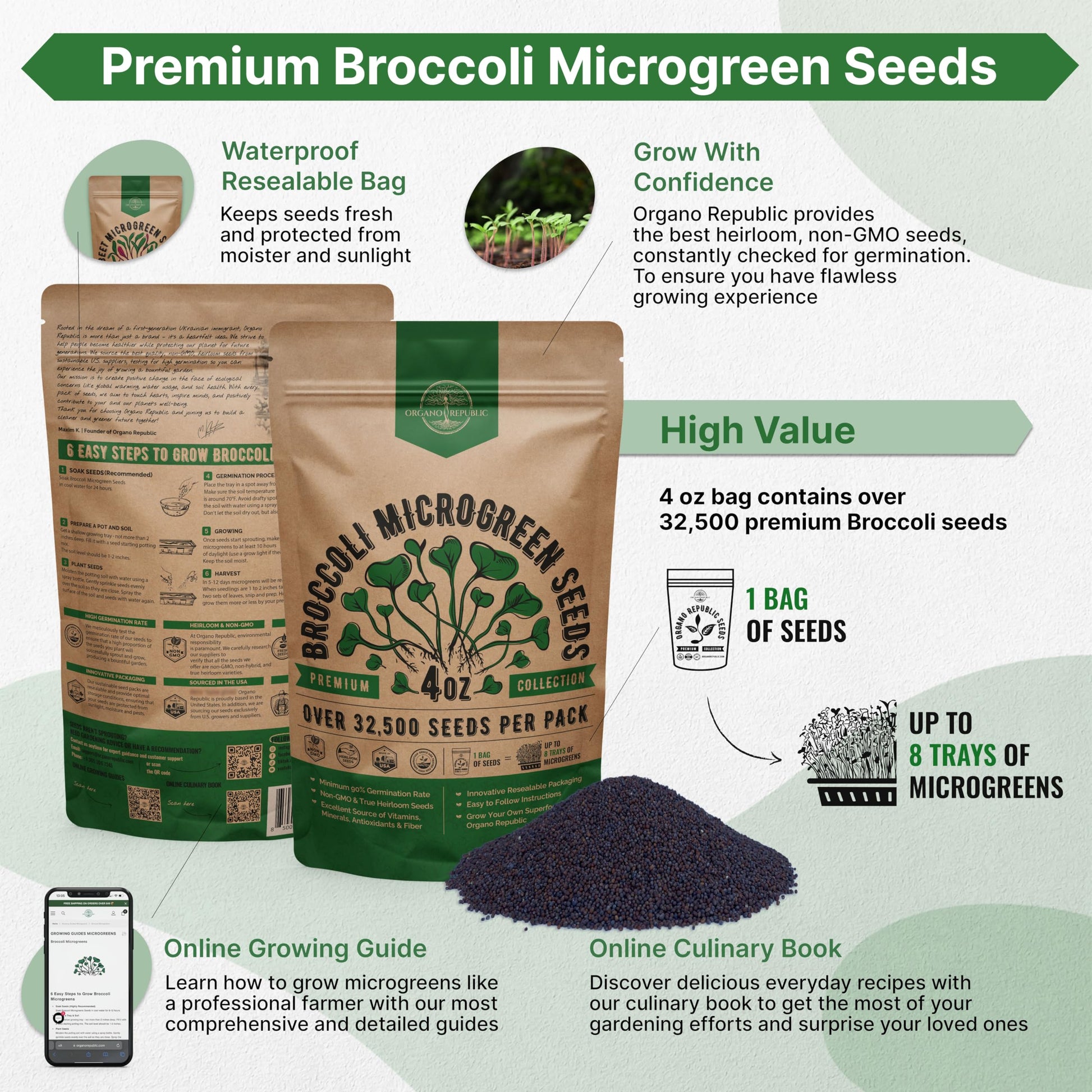 Organo Republic Broccoli Sprouting & Microgreens Seeds - Non-GMO, Heirloom Sprout Seeds Kit, 1lb Resealable Bag for & Growing Microgreens in Soil, Coconut Coir, Aerogarden & Hydroponic