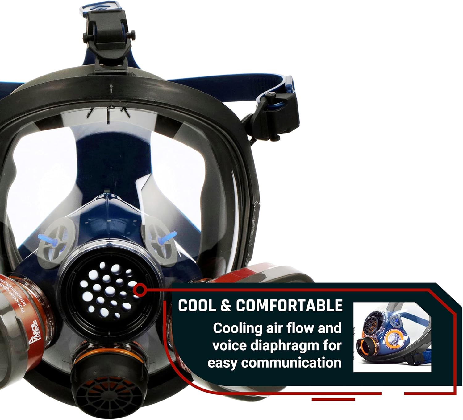 - Professional Heavy Duty Filtration – Dual Activated Charcoal filters, full face impact resistant lens.