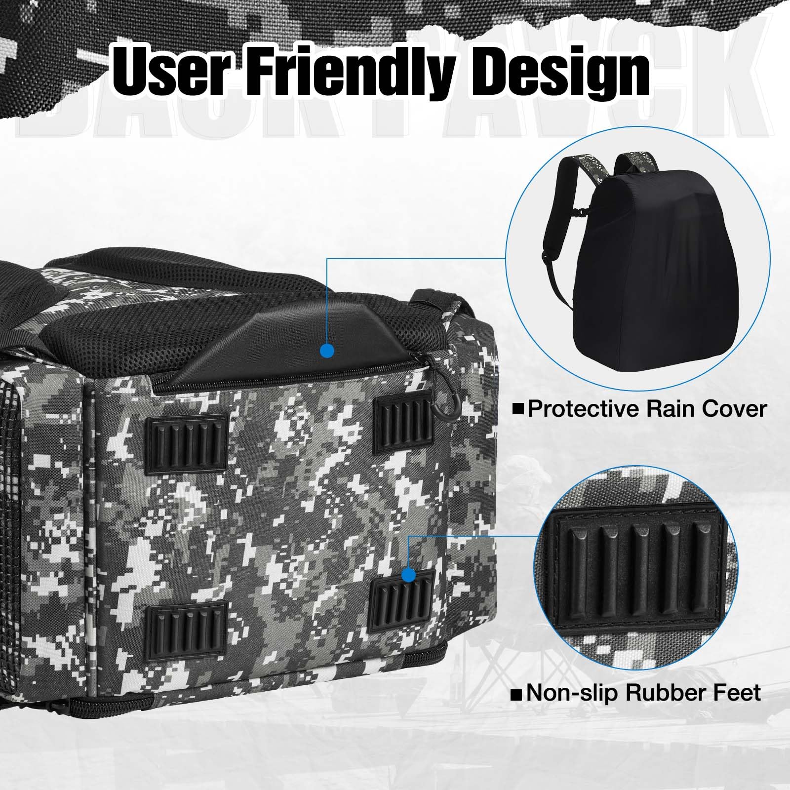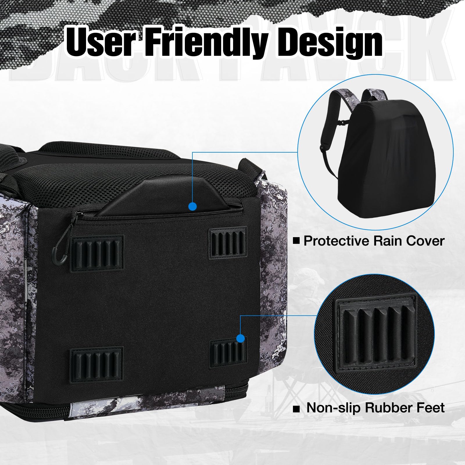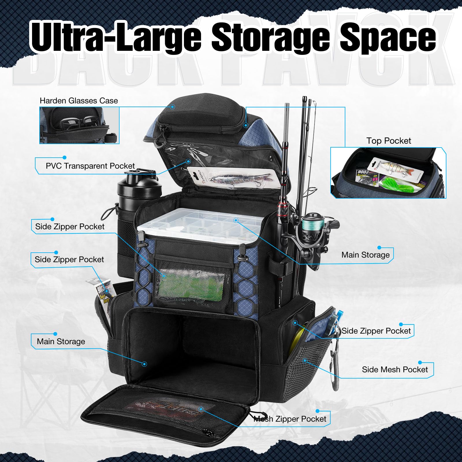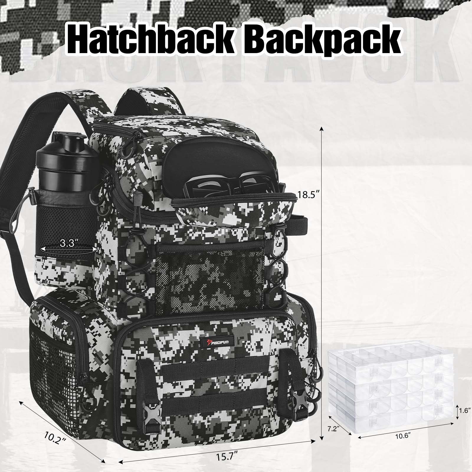 - Multifunctional: Our Hatchback backpack is equipped with a rod belt, side pocket, bottle holder, and front patch pocket, making it easy to safely store your fishing rods, water bottle, keys, clothes, fishing pliers, fish lip gripper, and more