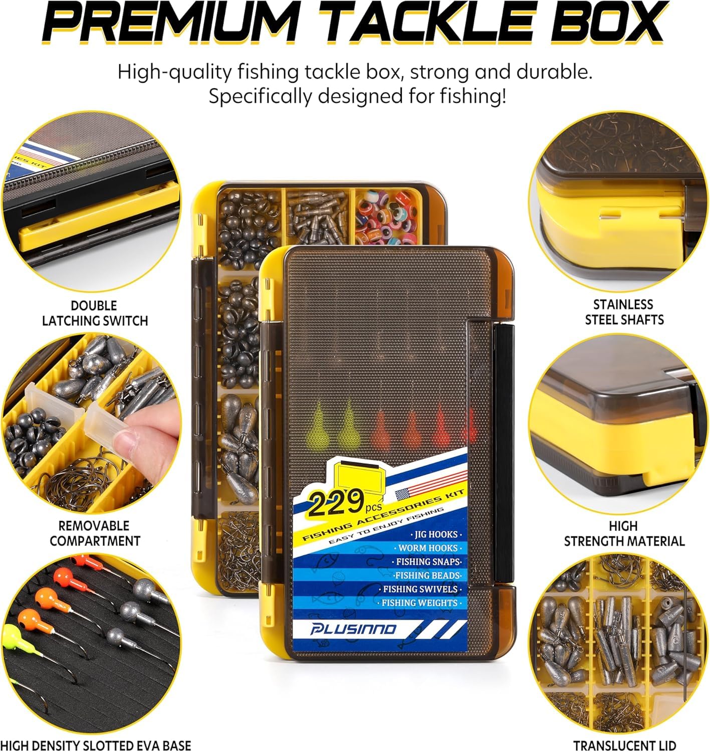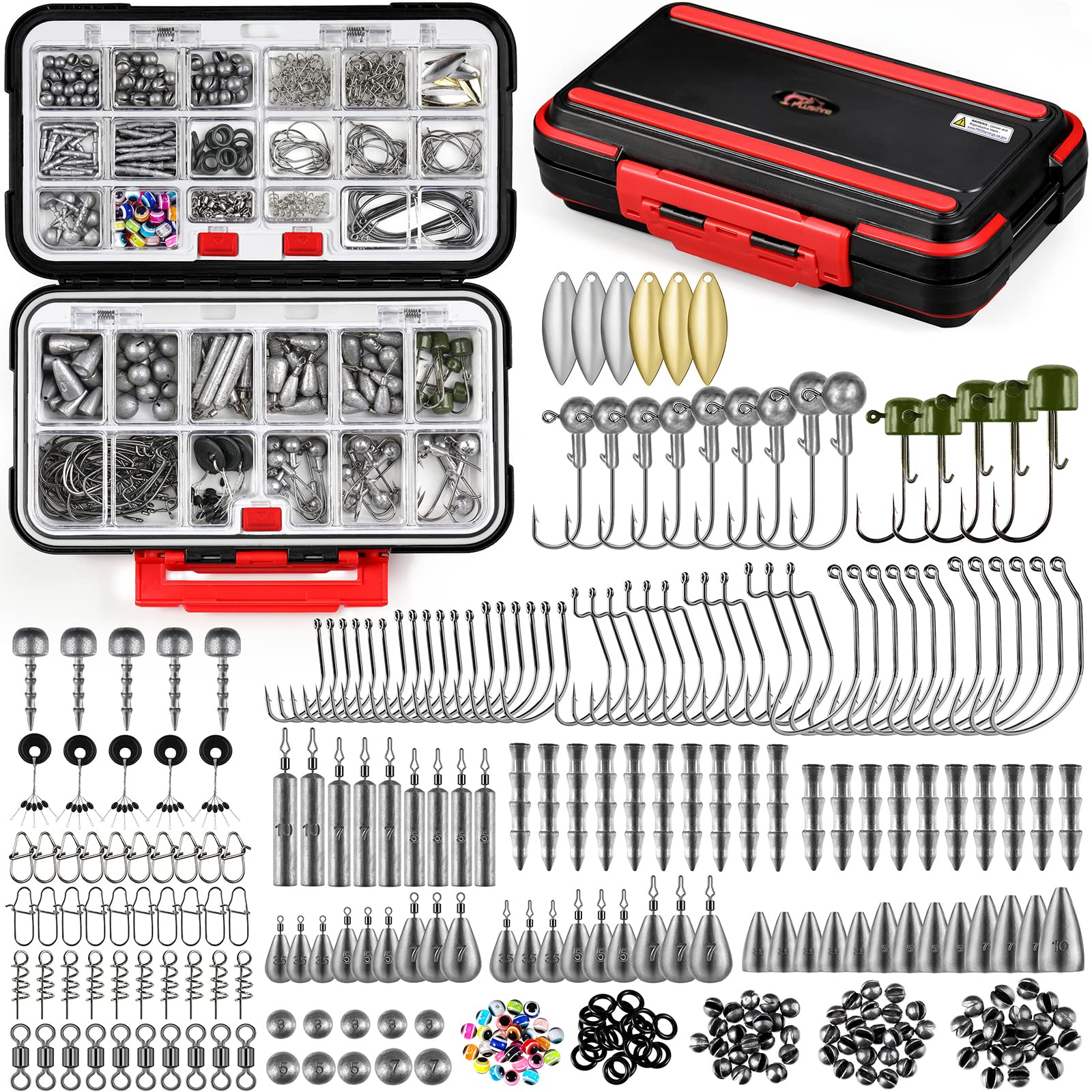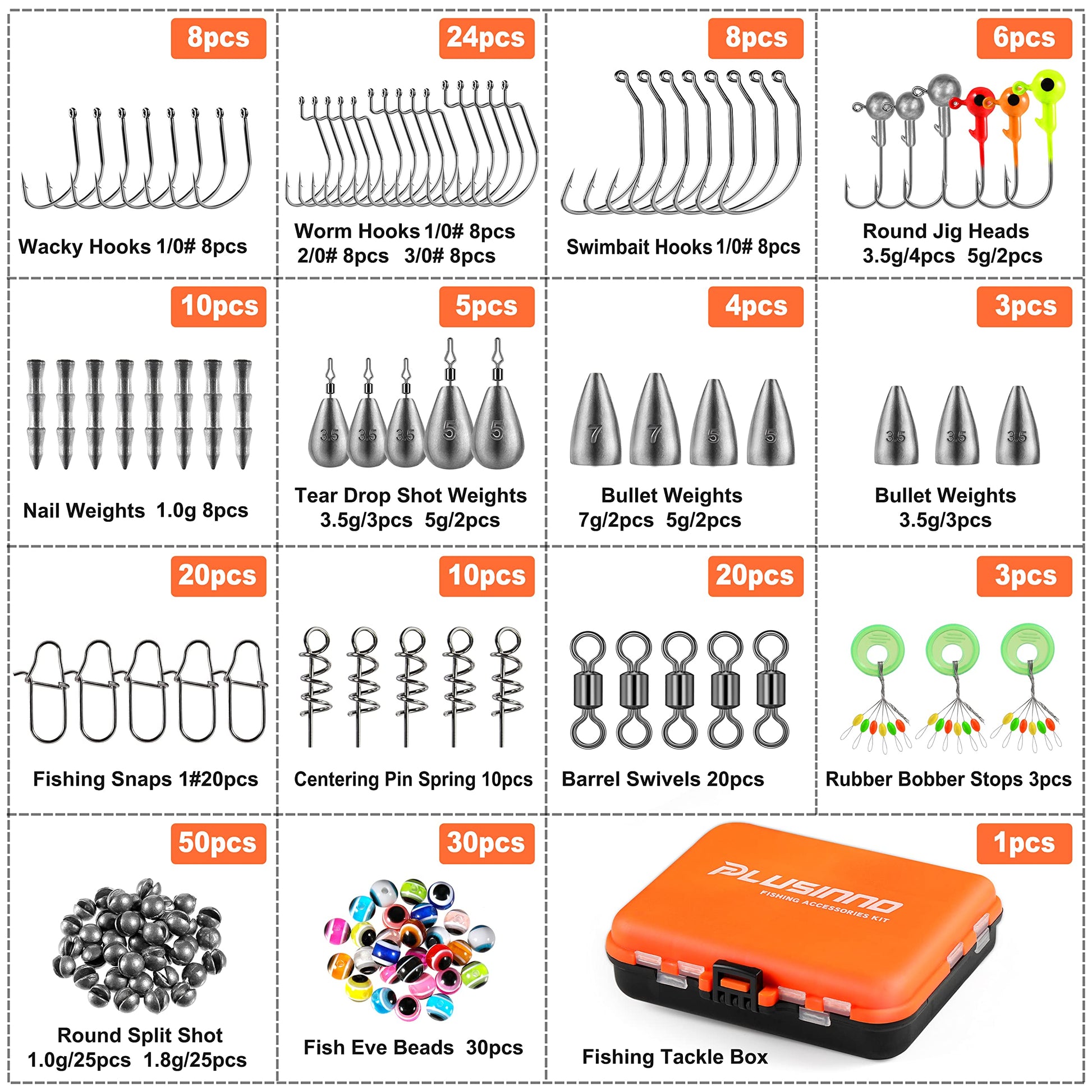 - 【All-in-One Fishing Tackle Kit】 PLUSINNO 229PCS Fishing Accessories Kit with Everything You Need! It collects nearly all accessories including Jig Heads, Offset Worm Hooks, Tear Free Rig Weights, Round Split Shots, Skinny Drop Shot Weights, Wacky Hooks, Nail Weights, Weights, Fishing Swivels, Duo-lock Snaps, Fish Eye Beads and so on. Especially suitable for Bass, Trout, Catfish, Perch, Crappie, Bluegill, and Walleye.