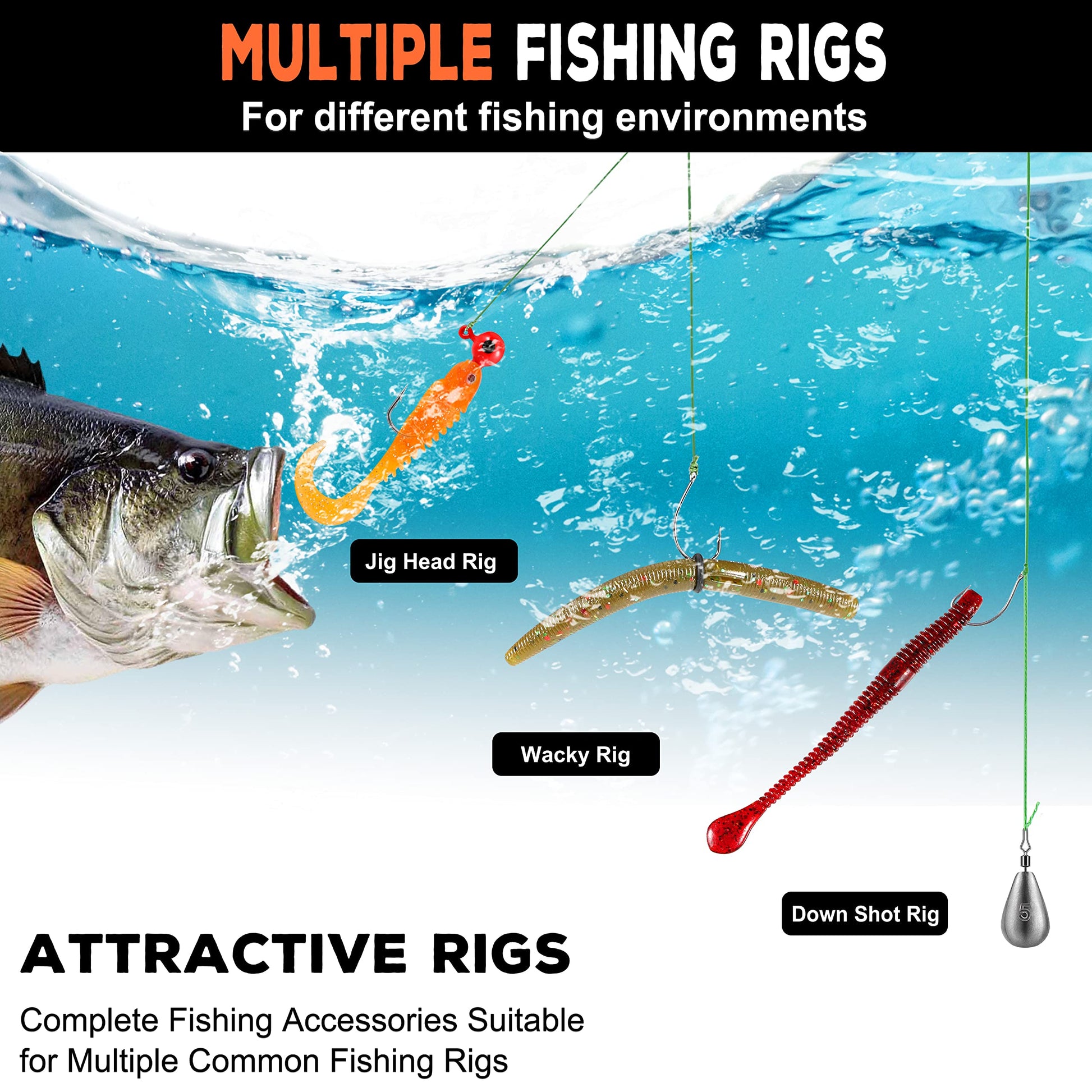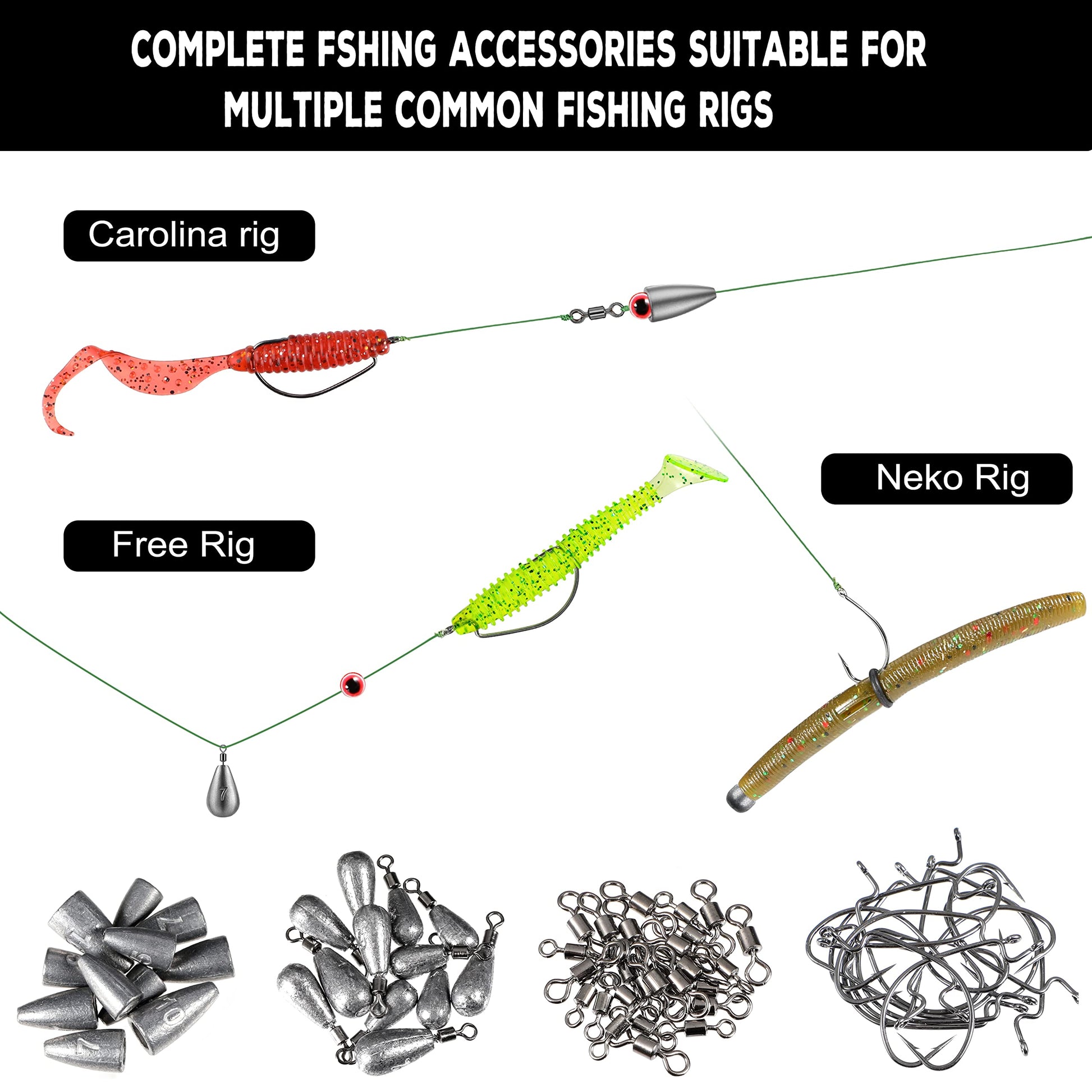 - 【Widely Fishing Rigs Combination】 Abundant fishing accessories in the tackle box, to put together a variety of fishing rigs you want! Such as Texas Rig, Carolina Rig, Weightless Rig, Split Shot Rig, Jig Head Rig, Free Rig, Wacky rig, Dropshot Rig and Neko Rig, complete fishing accessories kit is suitable in any season in any water conditions, meet your need to catch different fish. The practical assortment of fishing tackle kit will absolutely help your big catch!