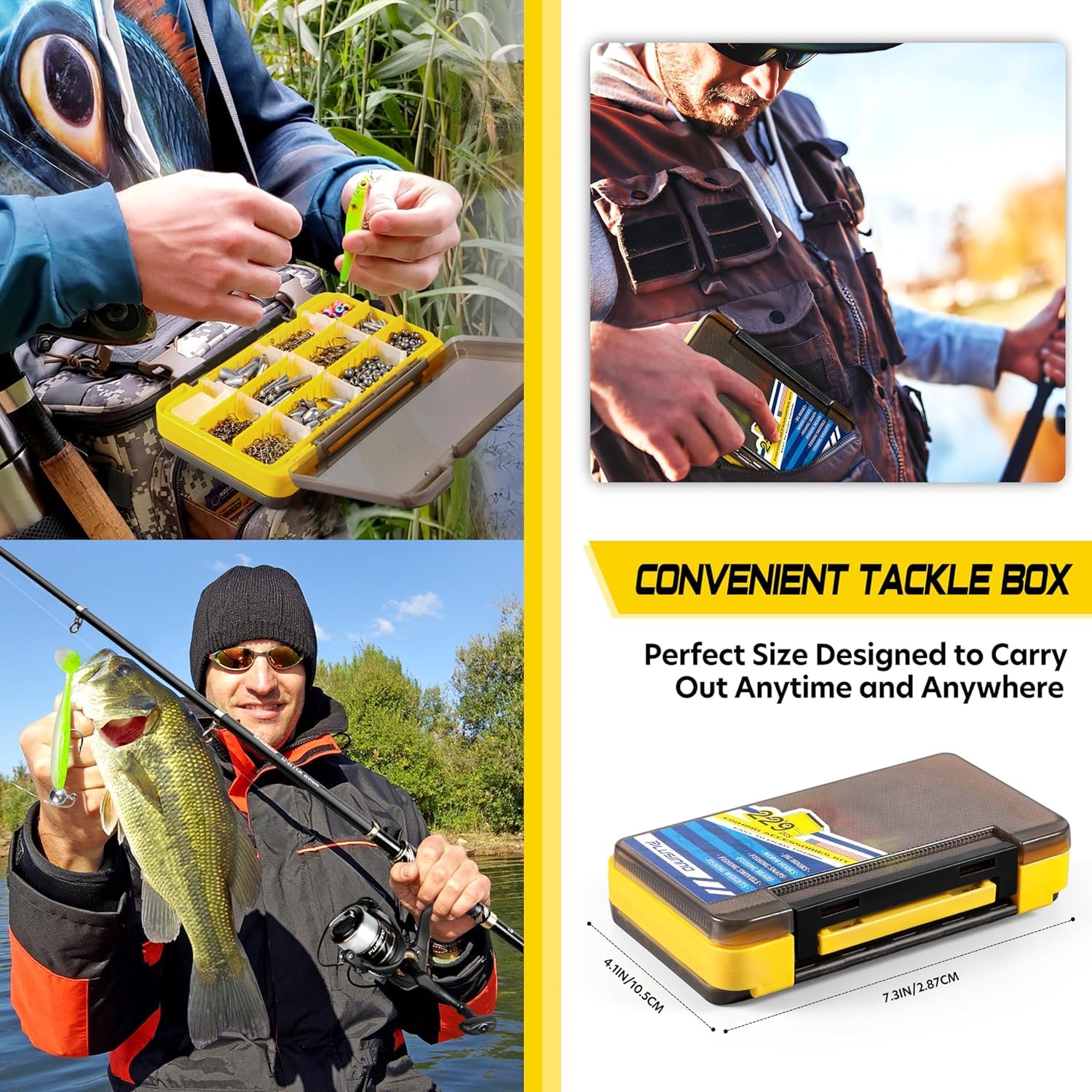 - 【Unique double-sided design Tackle Box】 The fishing tackle box is designed with double-sided construction to ensure maximum durability and protection for your fishing gear! One side design with adjustable dividers, it's easy to organize and fit the right lure for the right occasion. Other side has high density slotted EVA base with fishing hooks Jig Heads, give perfect protect to the hook tip! It easily fits in your fishing seat box, fishing backpack and vest's pocket, enjoy fishing anywhere.