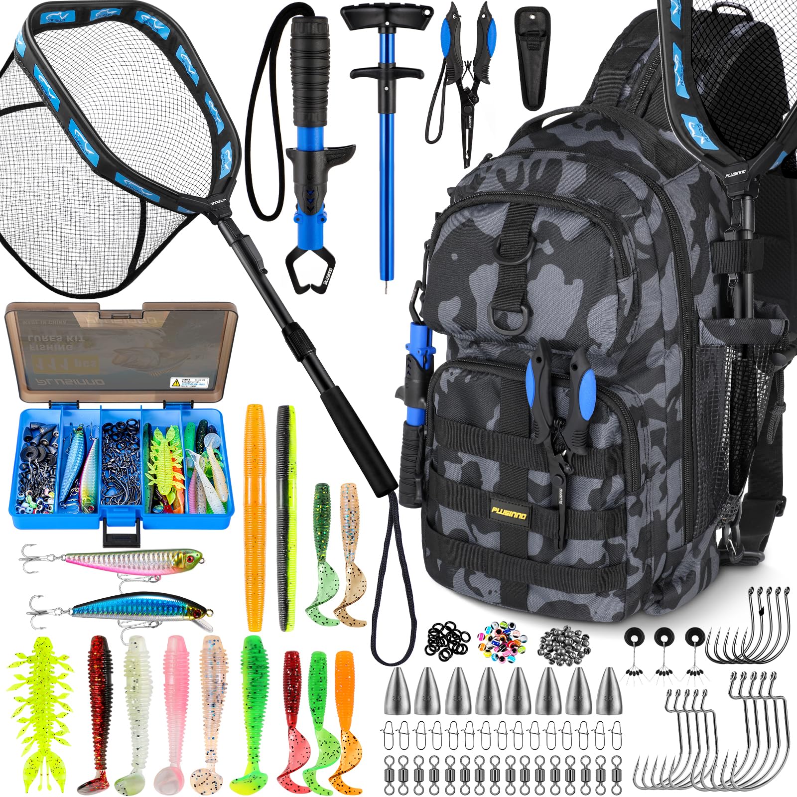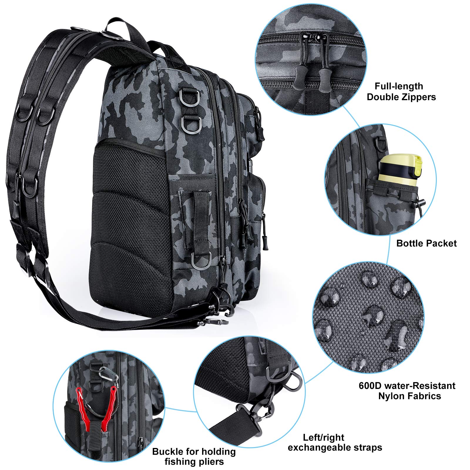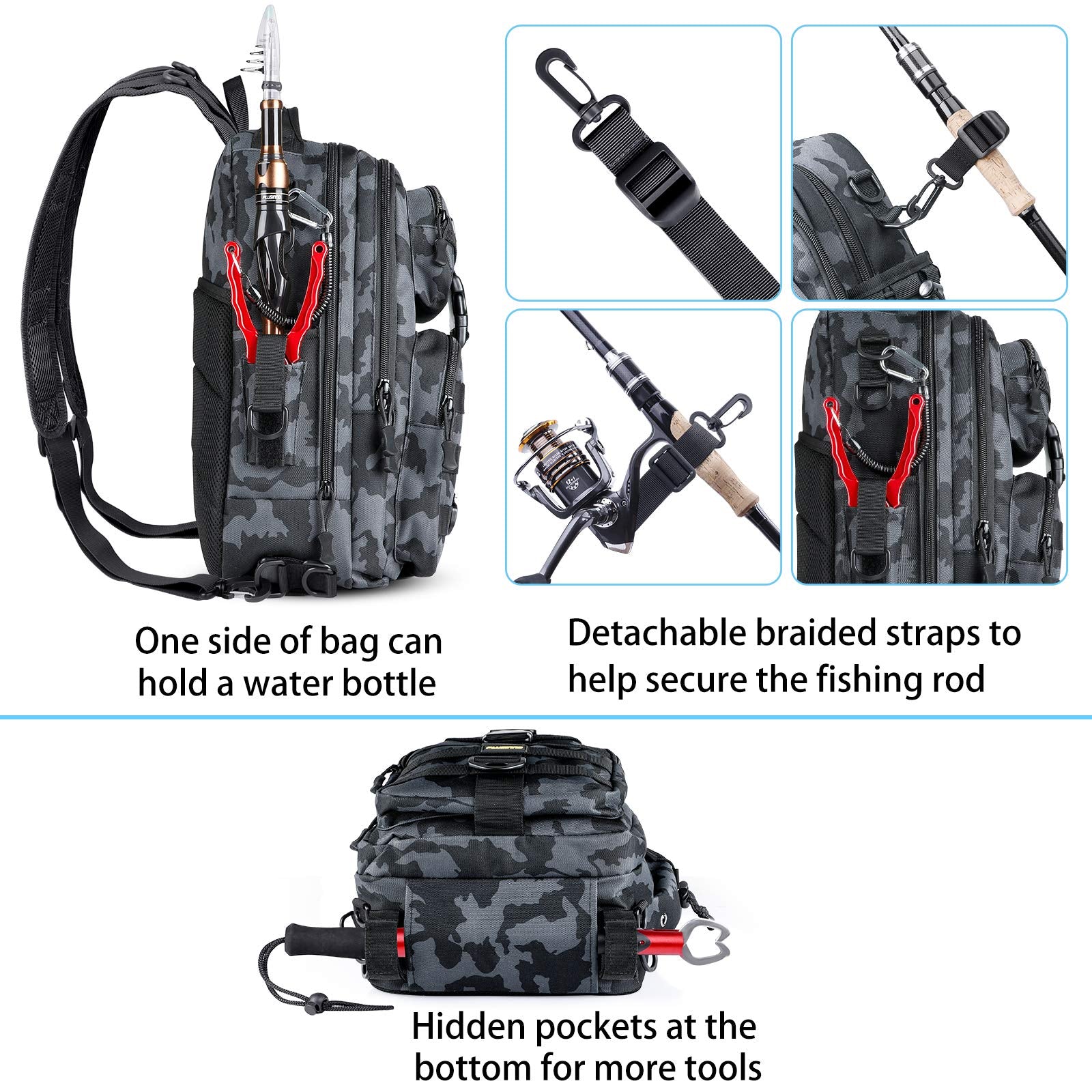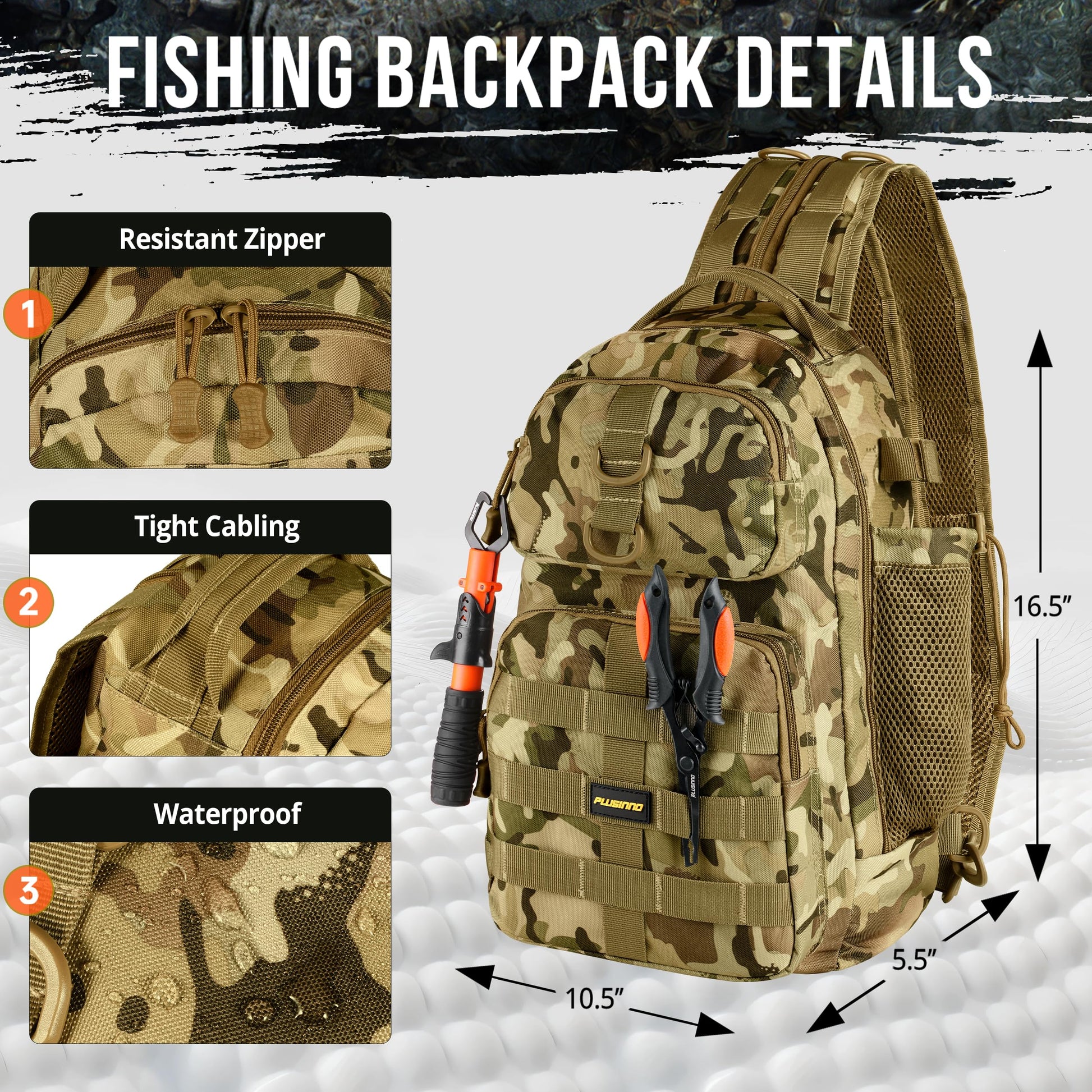 PLUSINNO Fishing Backpack with Tackle Boxes, Waterproof Fishing Sling Tackle Bag For Fishing Gear With Rod Holder, Fishing Gifts for Men With Fishing lures, Fishing pliers, Fish Lip Gripper.