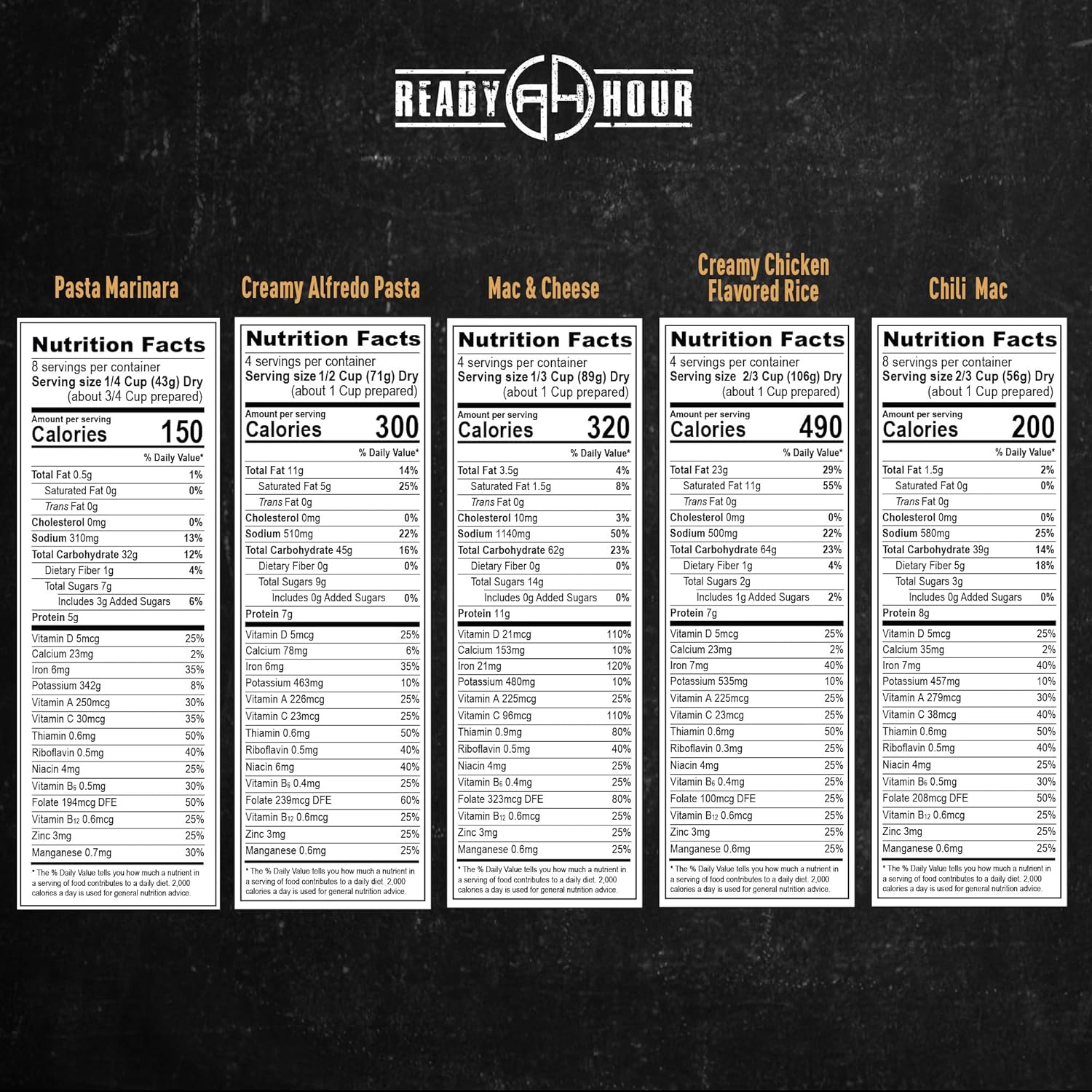 - NO FOOD BOREDOM: Mix and match your meals with 22 varieties of breakfasts, lunches, dinners, snacks, and drinks. Choose from Buttermilk Pancake Mix, Creamy Chicken Flavored Rice, Pasta Marinara, Chocolate Pudding, Orange Flavored Energy Drink Mix, and more!