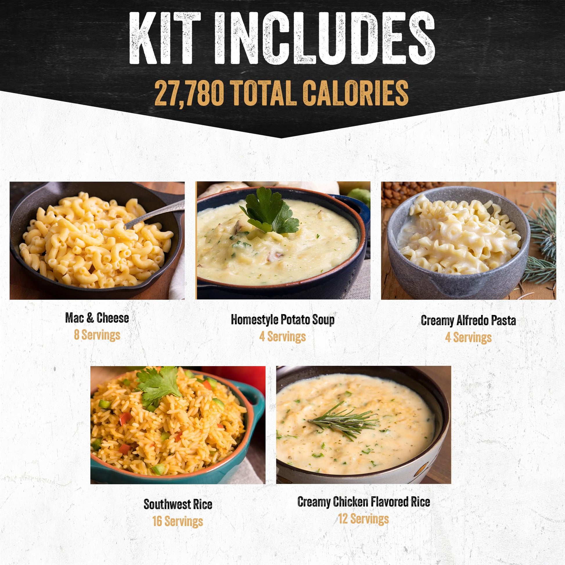 - 20 EASY TO PREPARE SERVINGS – Includes Homestyle Potato Soup (4), Mac & Cheese (4), Maple Grove Oatmeal (8), and Creamy Chicken Flavored Rice (4). Just add water and enjoy real meals.