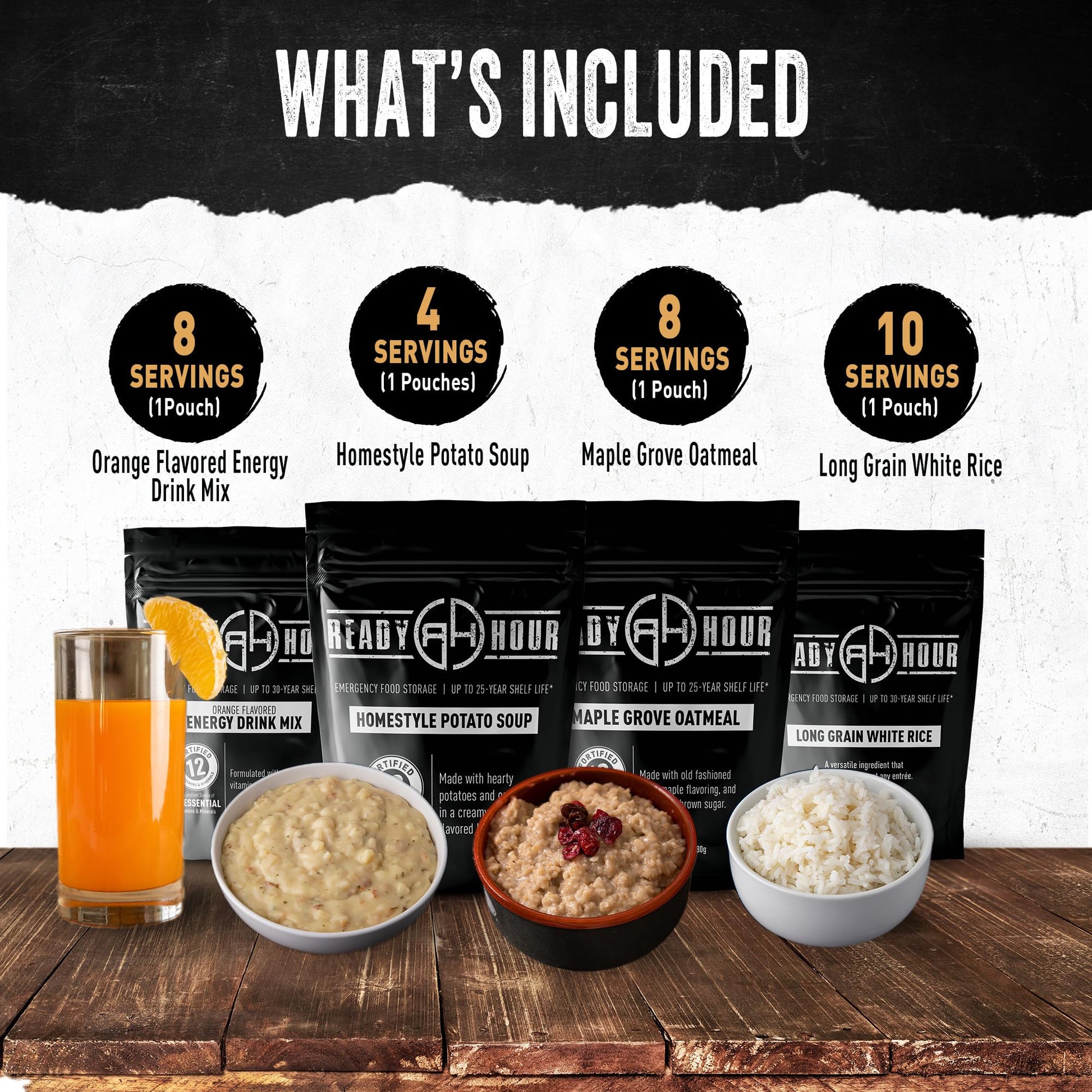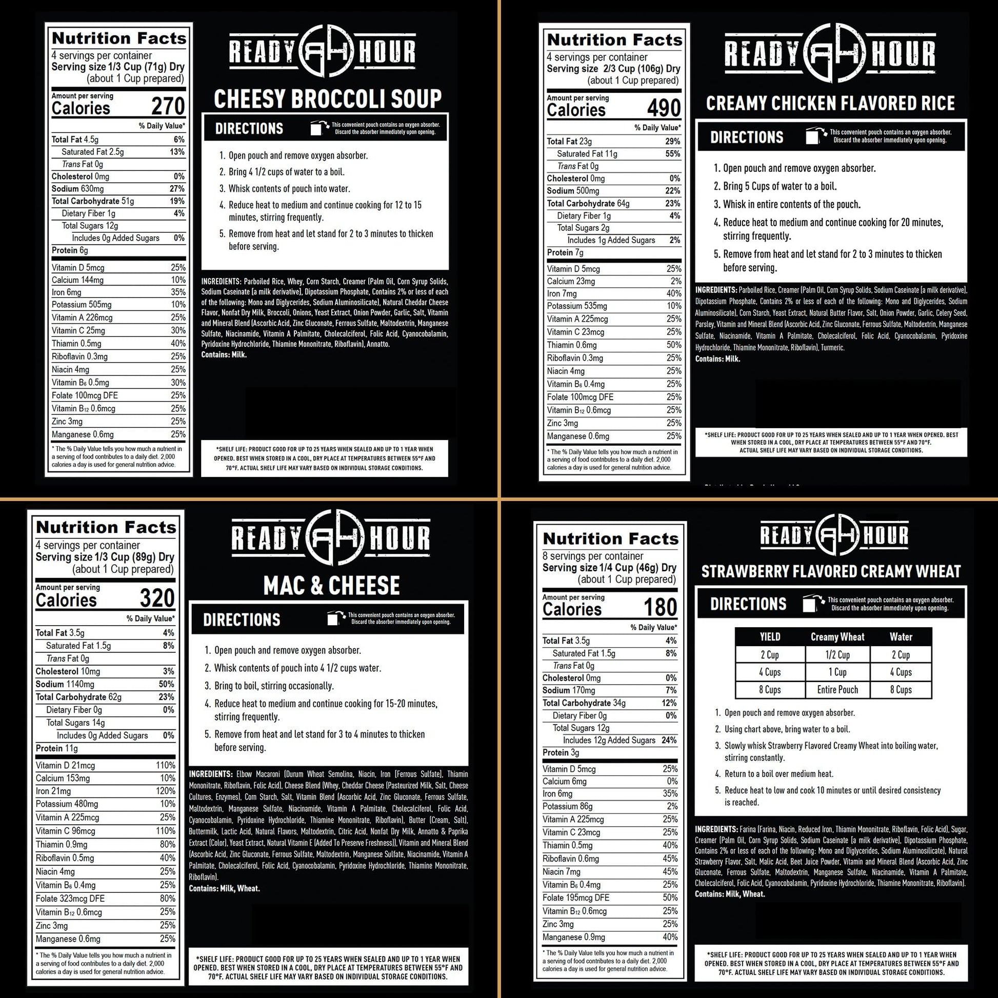 CALORIES = ENERGY = SURVIVAL When disaster strikes or life throws the unexpected your way, calories are not just numbers on a label. They are energy, strength, and survival. That is why we built this 72 Hour Kit to give one person more than 2,000 calories per day for three days straight. In total, you get 6,240 calories of dependable meals you can trust. Inside are 20 servings of four familiar varieties: Homestyle Potato Soup, Mac & Cheese, Maple Grove Oatmeal, and Creamy Chicken Flavored Rice. These meals are designed to satisfy, not just get you by. In a crisis, that makes a difference. Every pouch is packaged tough with a 4 layer seal and oxygen absorbers to help extend shelf life. Store them away today and rely on them tomorrow with confidence. No MSG, no fillers, just straightforward food built for emergencies. At Ready Hour, preparedness is not a trend, it is our way of life. We are the original Patriot company, and we take survival seriously. Our meals stand up in quality and in value, giving you the calories, nutrition, and assurance you need.