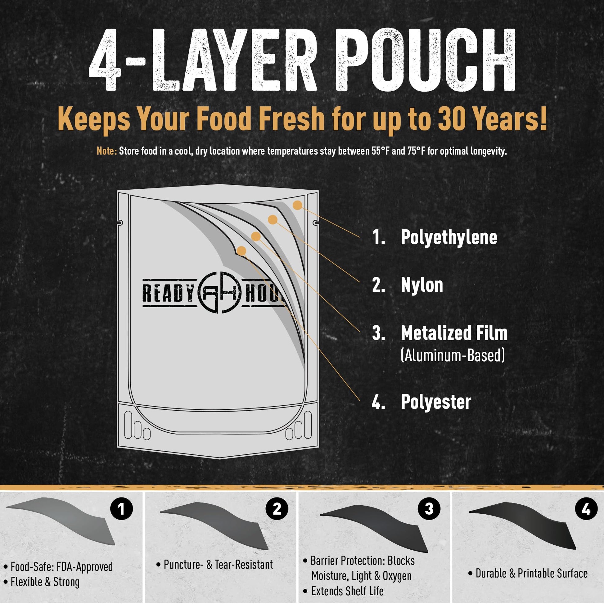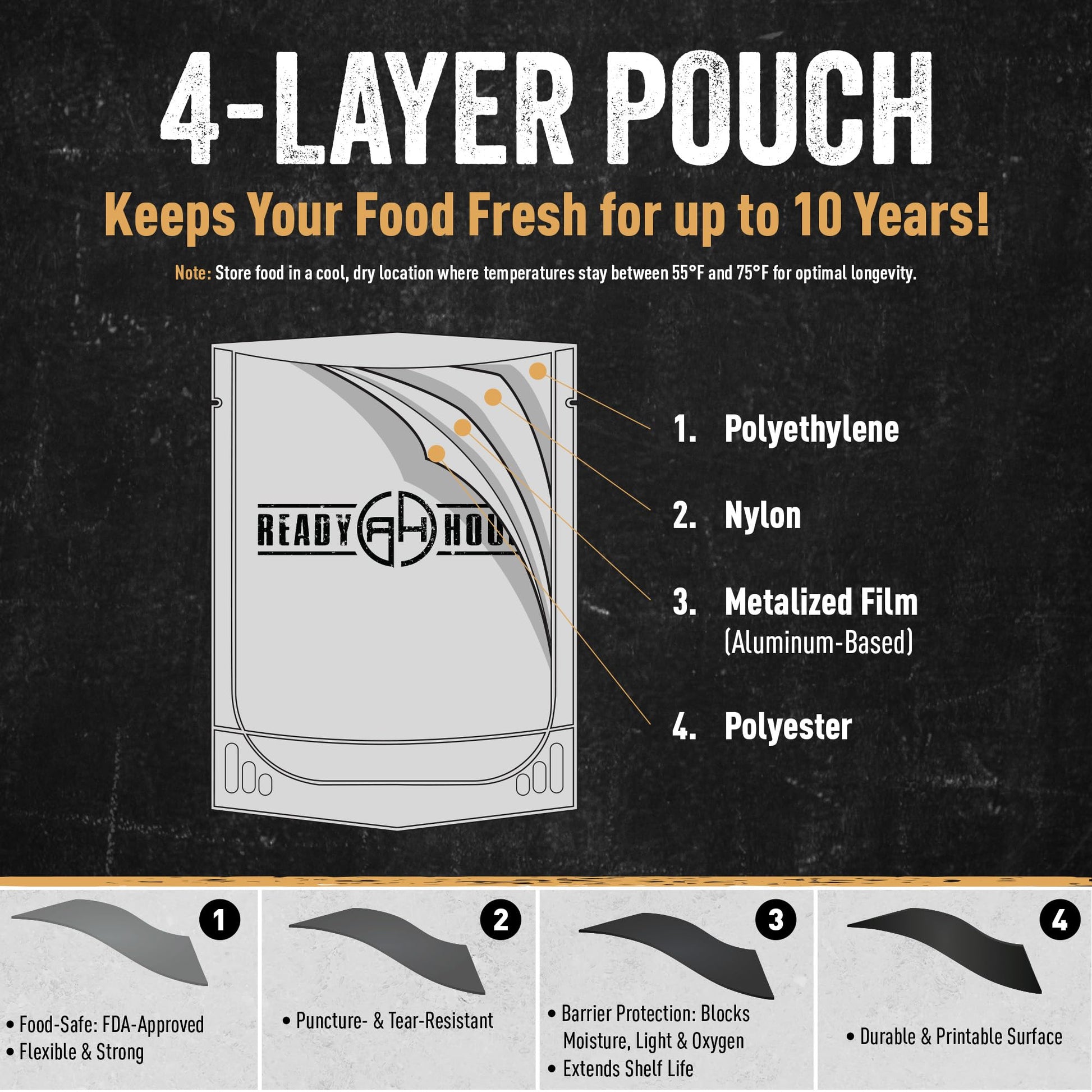 - COMPACT, STACKABLE, AND PORTABLE – Durable 4-layer pouches are resealable, space-saving, and perfect for storing in your prepper pantry, RV, or camping gear. Take it anywhere—you’ll be glad you did.