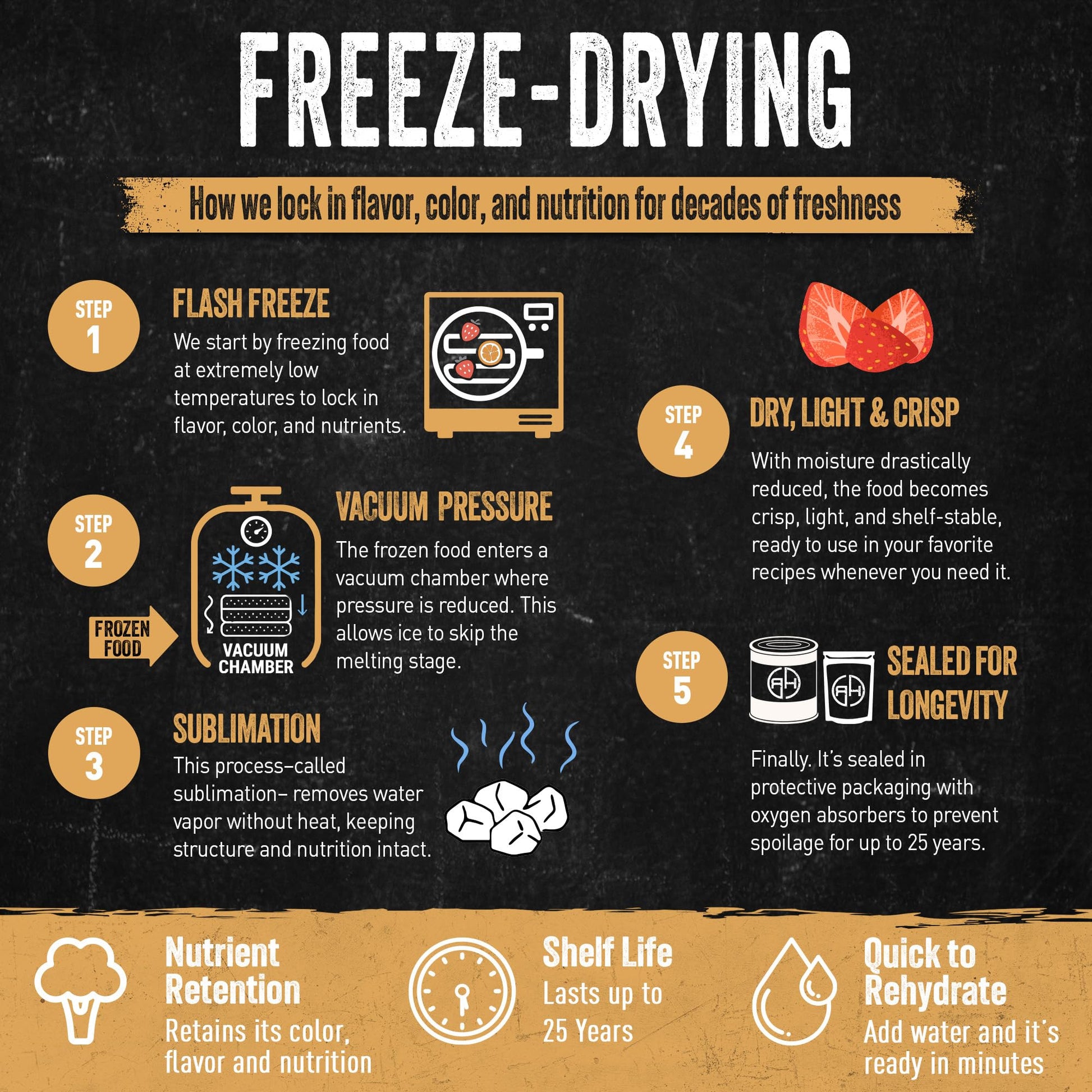 - FREEZE-DRIED FOR MAXIMUM SHELF LIFE – Our freeze-drying process locks in freshness, taste, and texture while extending shelf life up to 30 years. No refrigeration required—perfect for long-term food storage and survival planning.