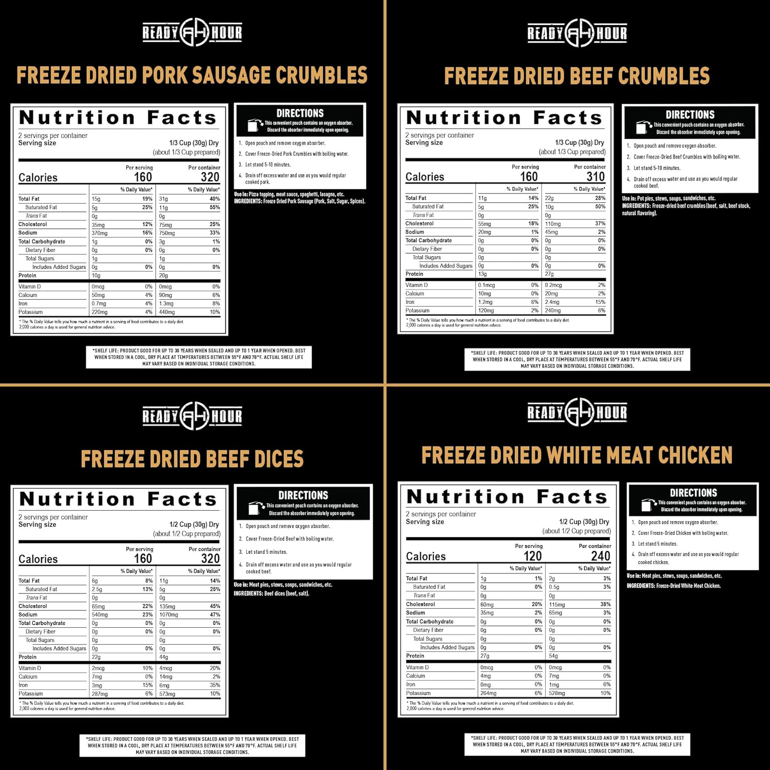- PREPARE WITH PROTEIN: Meat is hard to come by when disaster strikes! Don’t be left scrounging for scraps. Stockpile this kit loaded with real, protein-packed meat, freeze-dried to lock in its succulent flavor and texture. Choose from beef crumbles, beef dices, chicken, and pork sausage offering a grand total of 334 grams of protein!