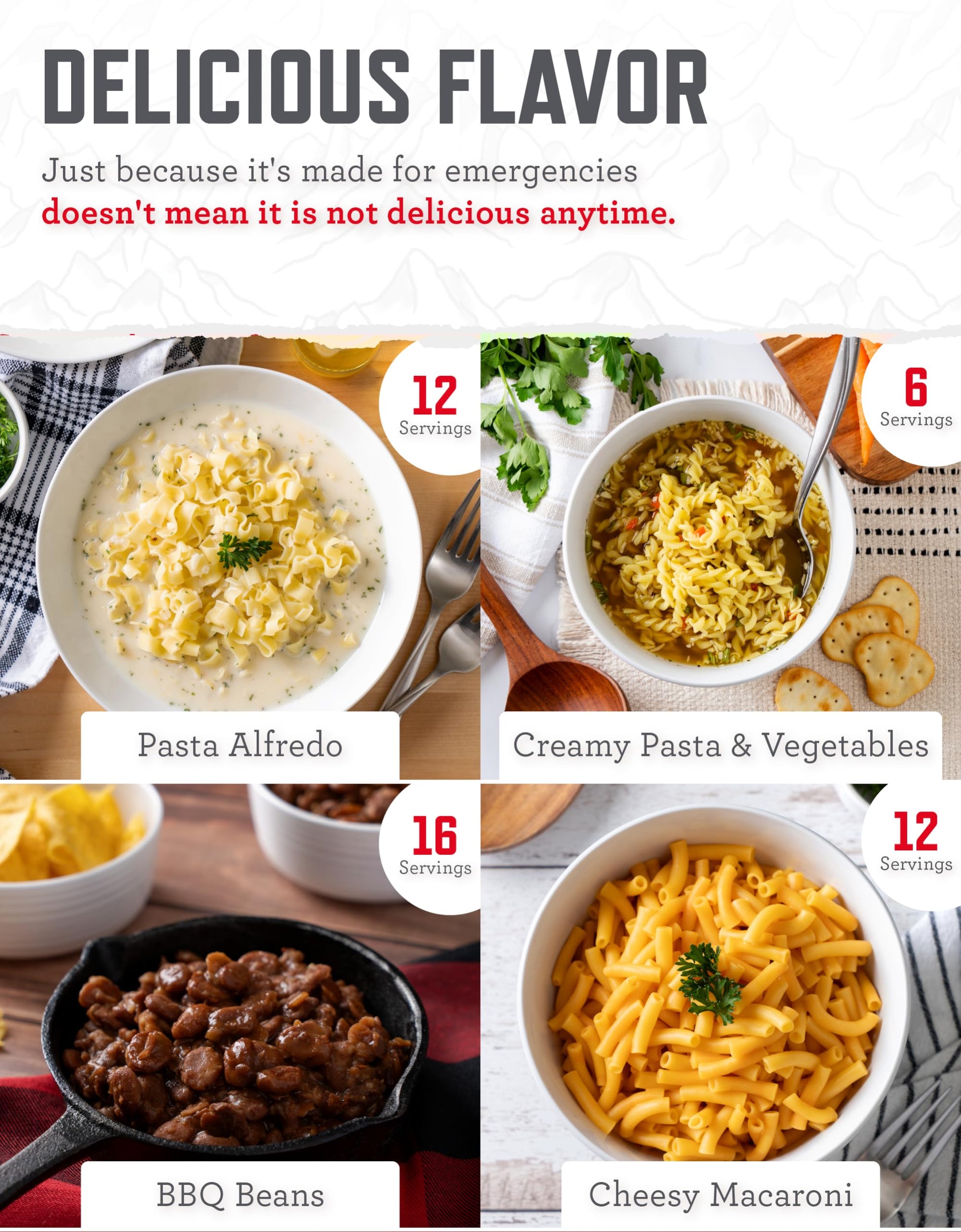 - EXTREME SITUATIONS (OR NOT): From power outages to packed schedules on busy weekdays, our survival food bucket offers prepared meals you can count on. Nutritious, tasty, and made to save time when you need it most!