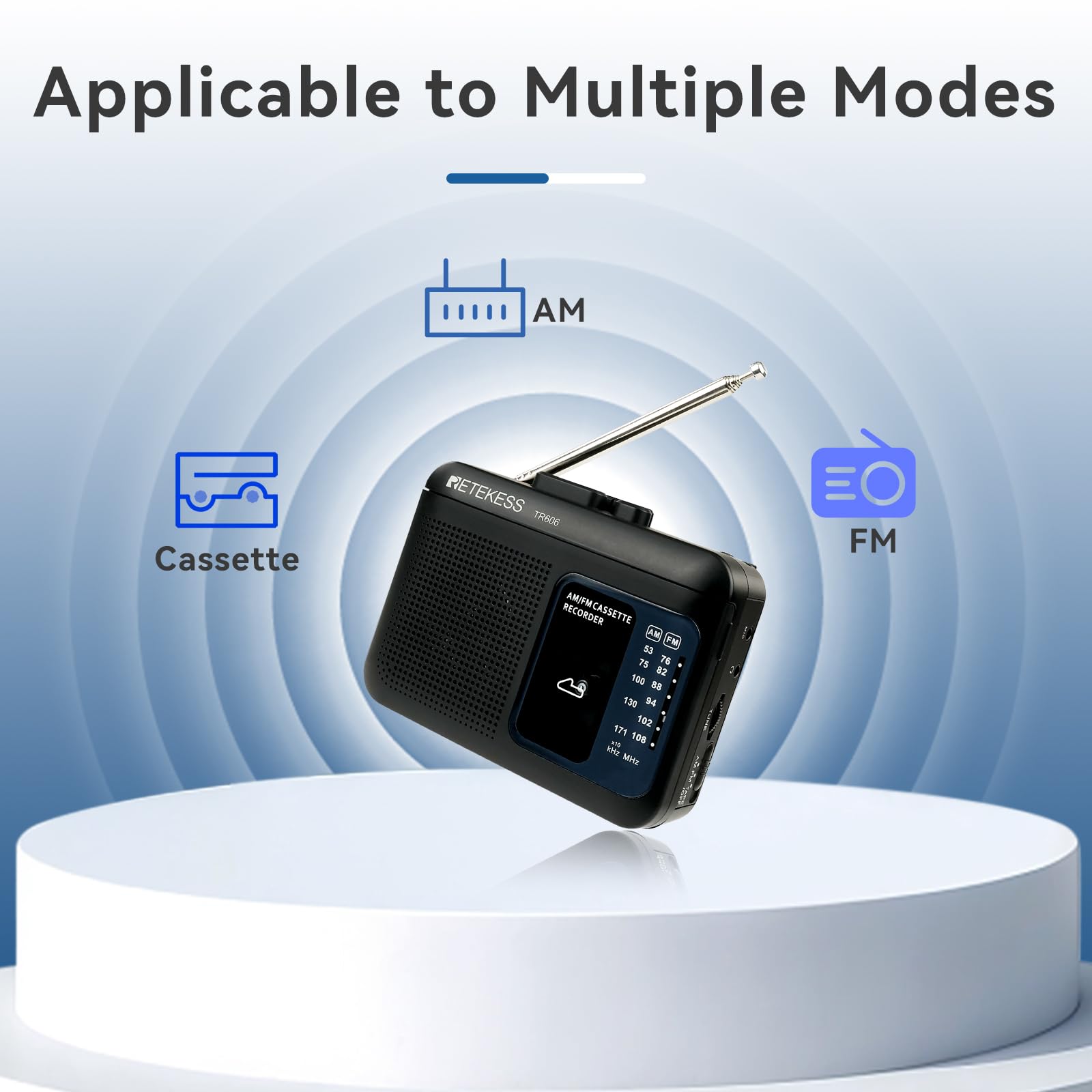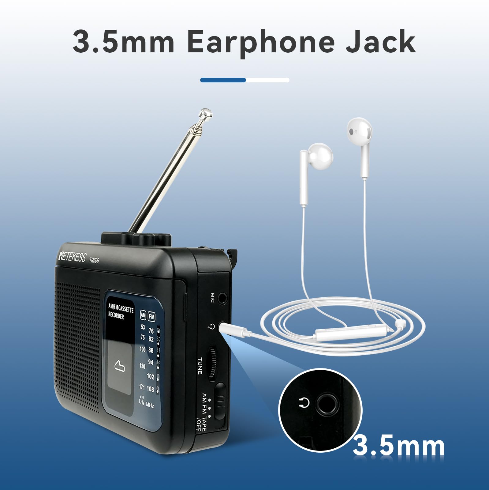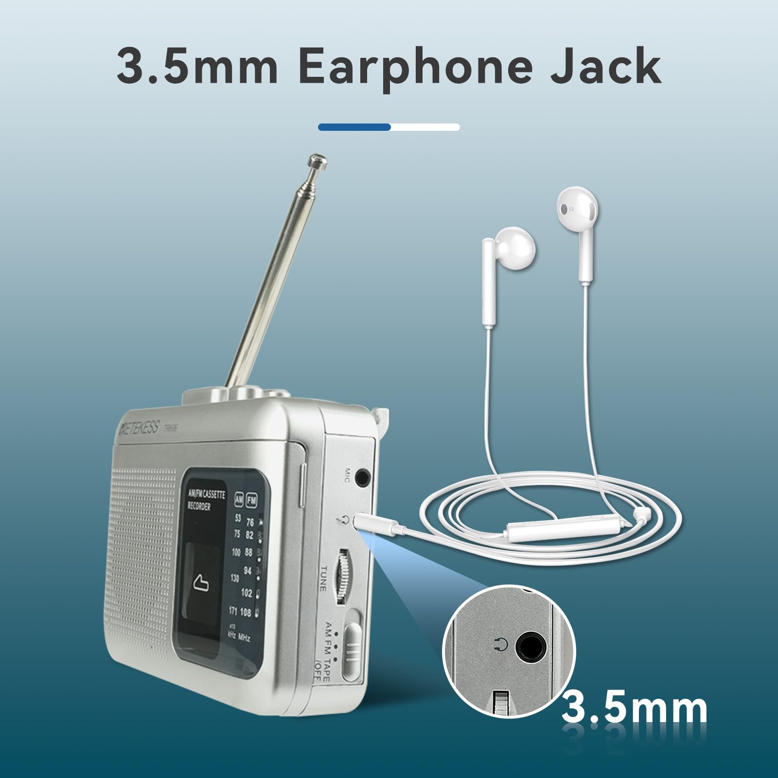 - AM FM cassette radio; AM: 530-1710KHz; FM: 76-108MHz; with 18.9inch antenna; you can enjoy radio while playing tape