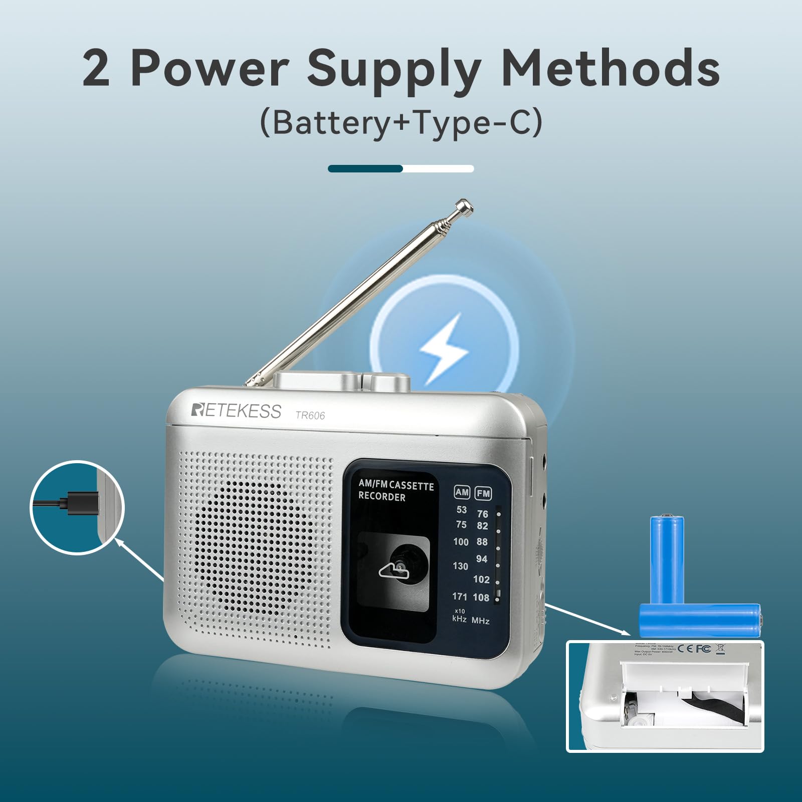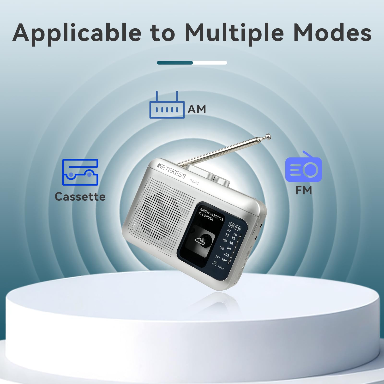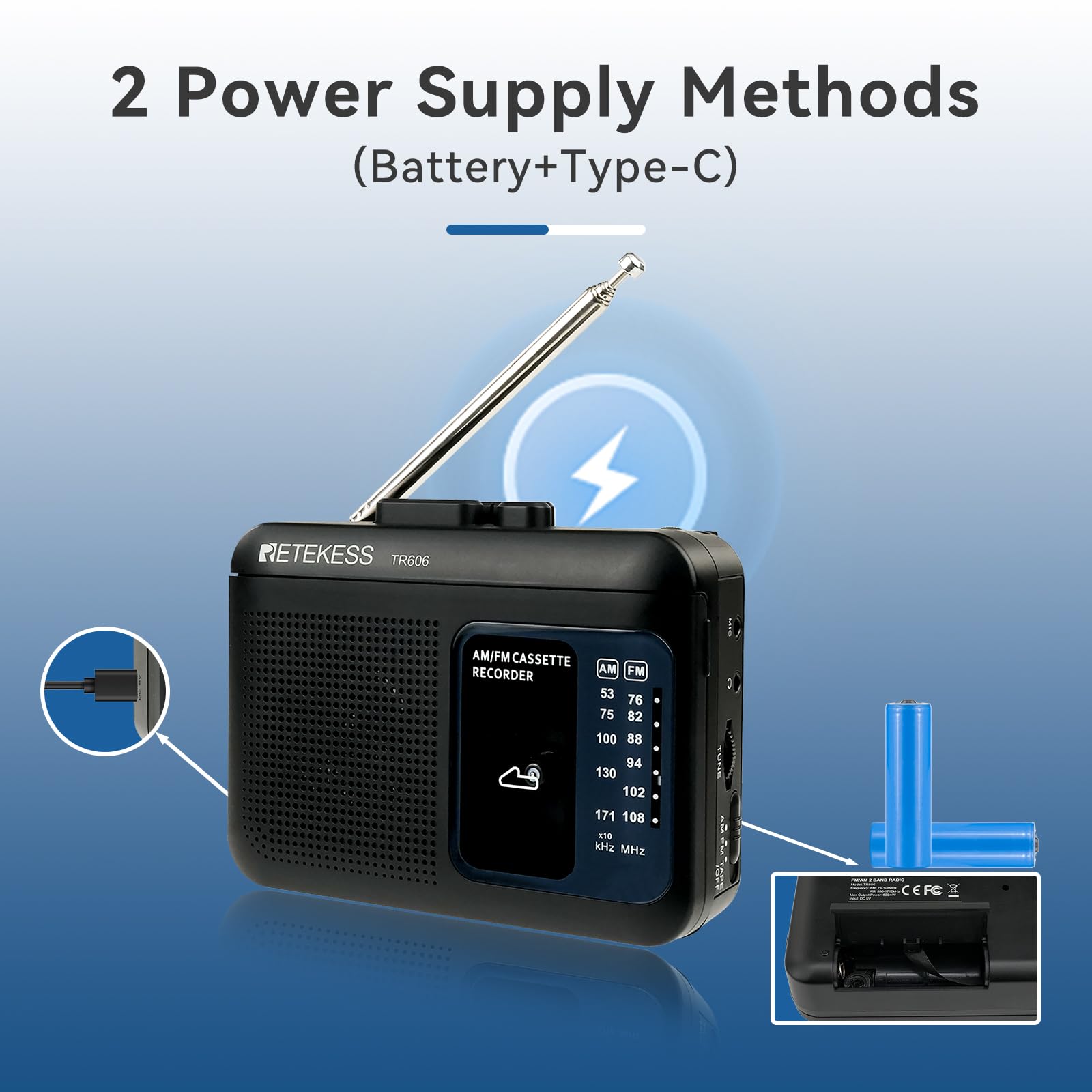 - AM FM cassette radio; AM: 530-1710KHz; FM: 76-108MHz; with 18.9inch antenna; you can enjoy radio while playing tape