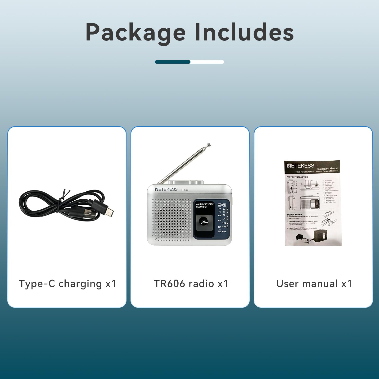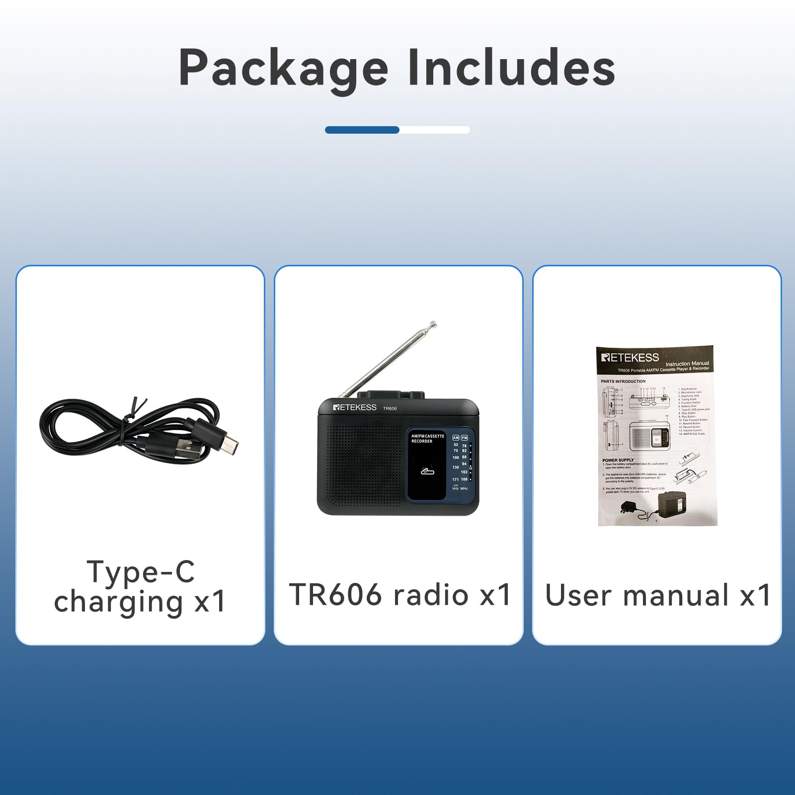 | Included Components | 1 x TR606 radio 1 x USB charging cable 1 x User manual |