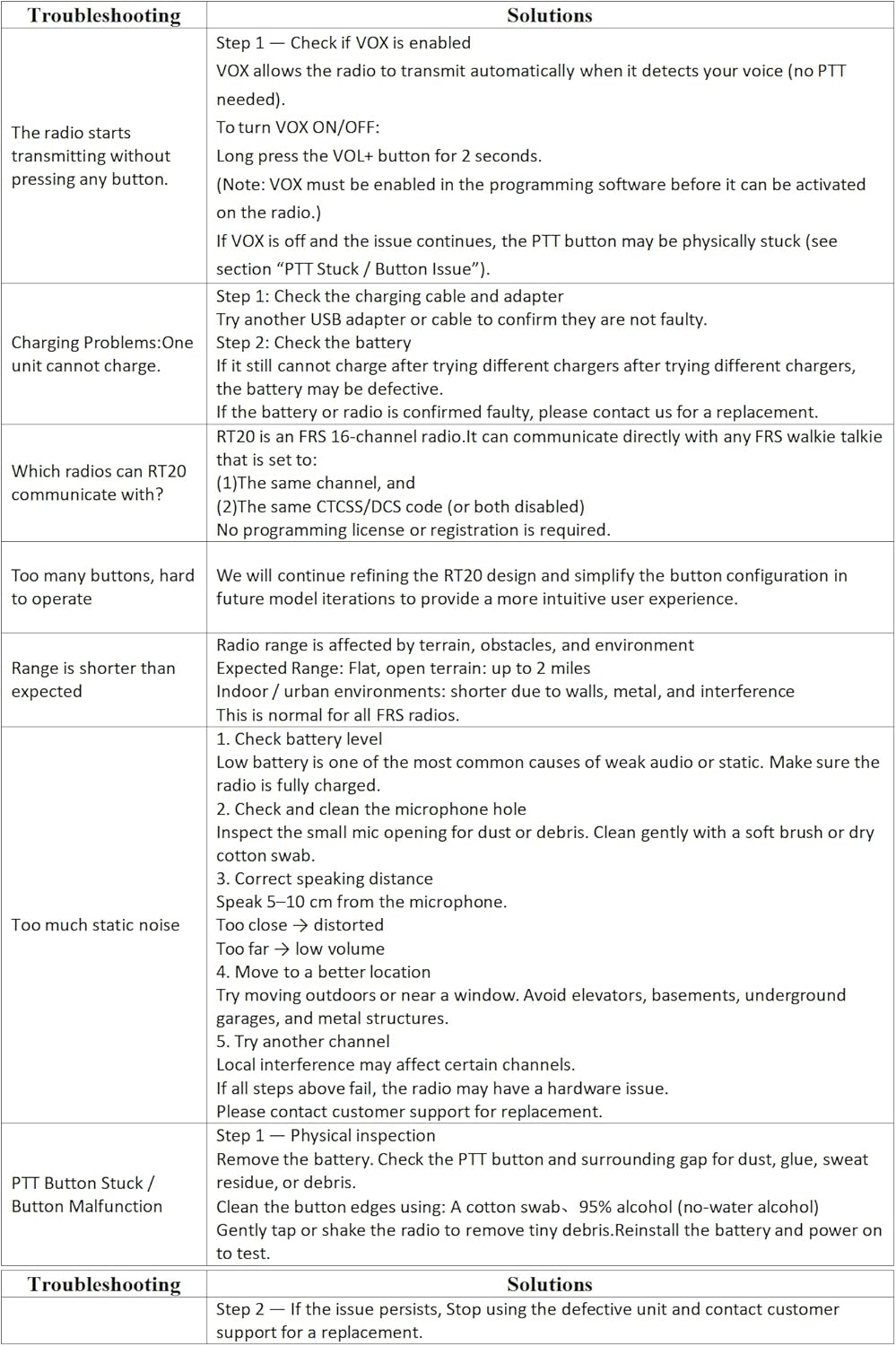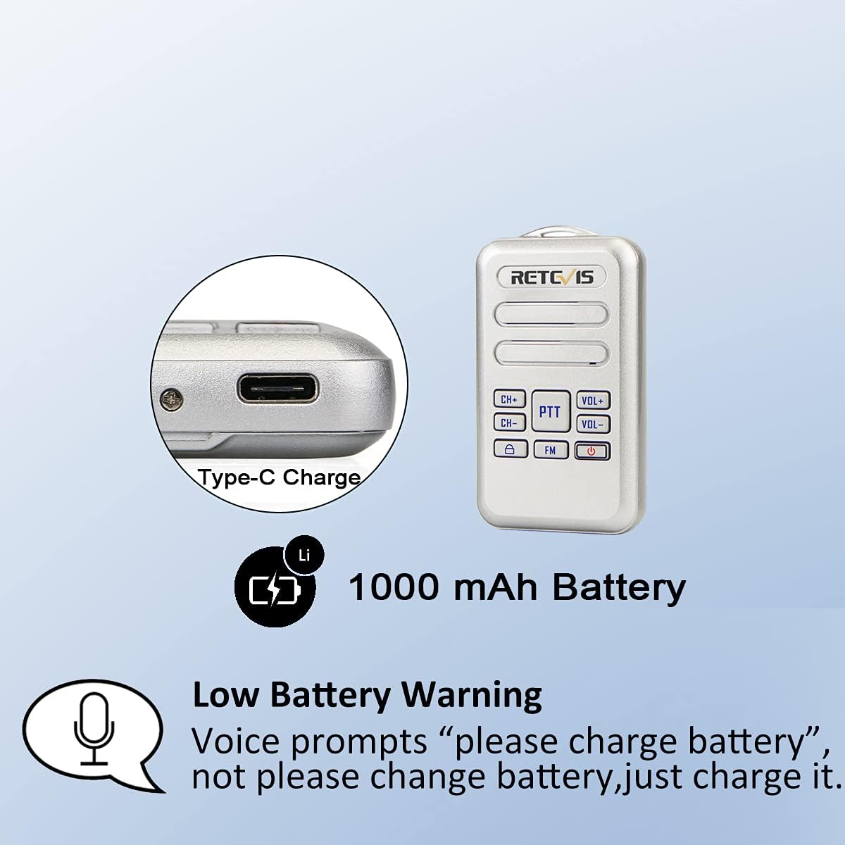 - Long lasting battery; 1000 mAh battery will last about 10-12 hours with normal daily usage; USB-C charging port are built in the 2 way radios;you can use power bank;PC;or car charger to charge it at any time; WARNING: The RT20 walkie-talkie charger outputs 5V; Car charger voltage should NOT exceed 6.5V