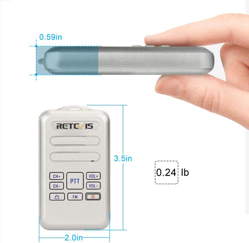 - Mini walkie talkie;3.5 x 2.01 x 0.59 inches; 0.2lb; The compact two way radio comes with a with a blue rope that hangs easily around your neck so it won't fall off and won't feel heavy
