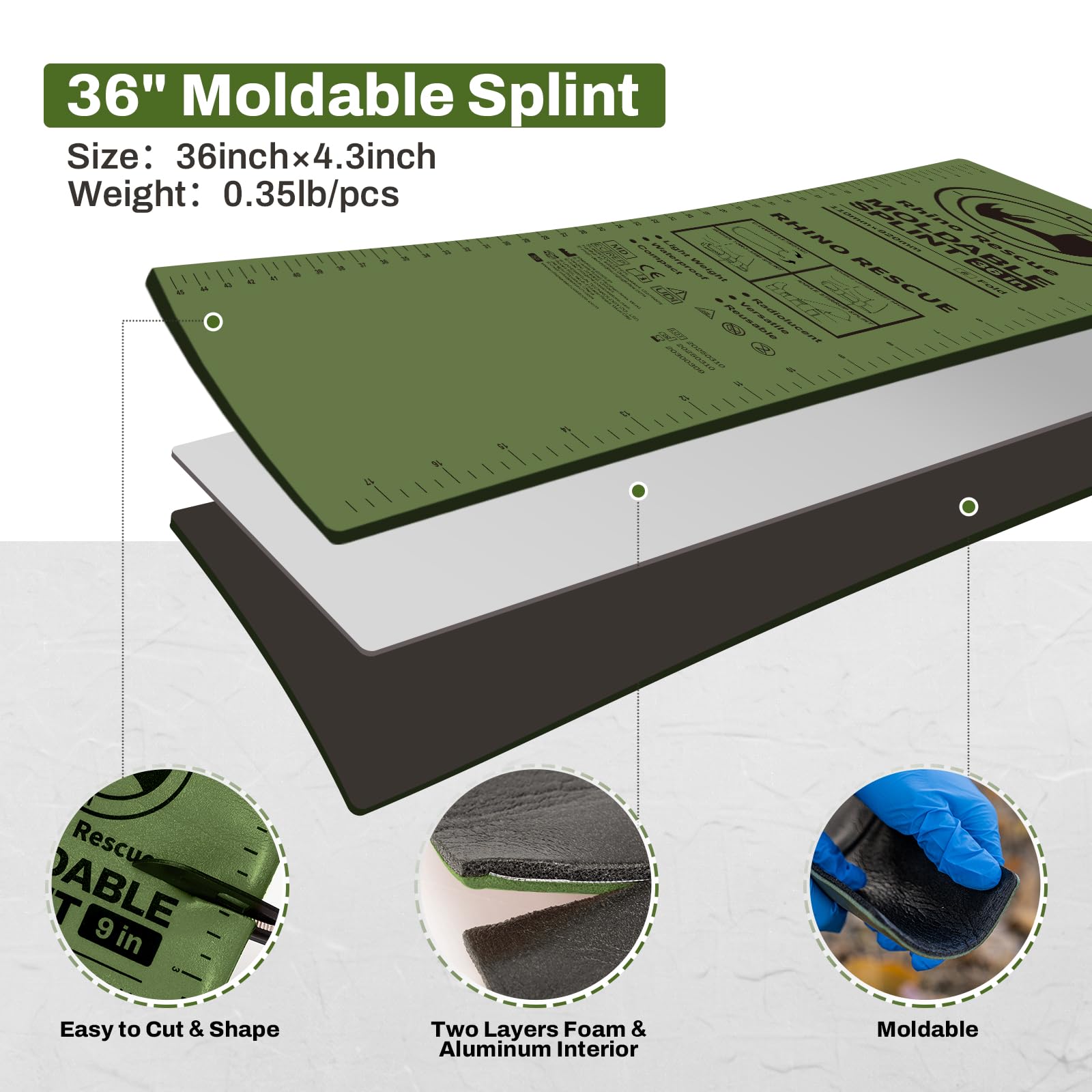 - 【Strong Support】The RHINO RESCUE Splint is built from a thin, light core of aluminum alloy which is then sandwiched between two layers of closed-cell foam, strong enough for pre- or post-cast care.