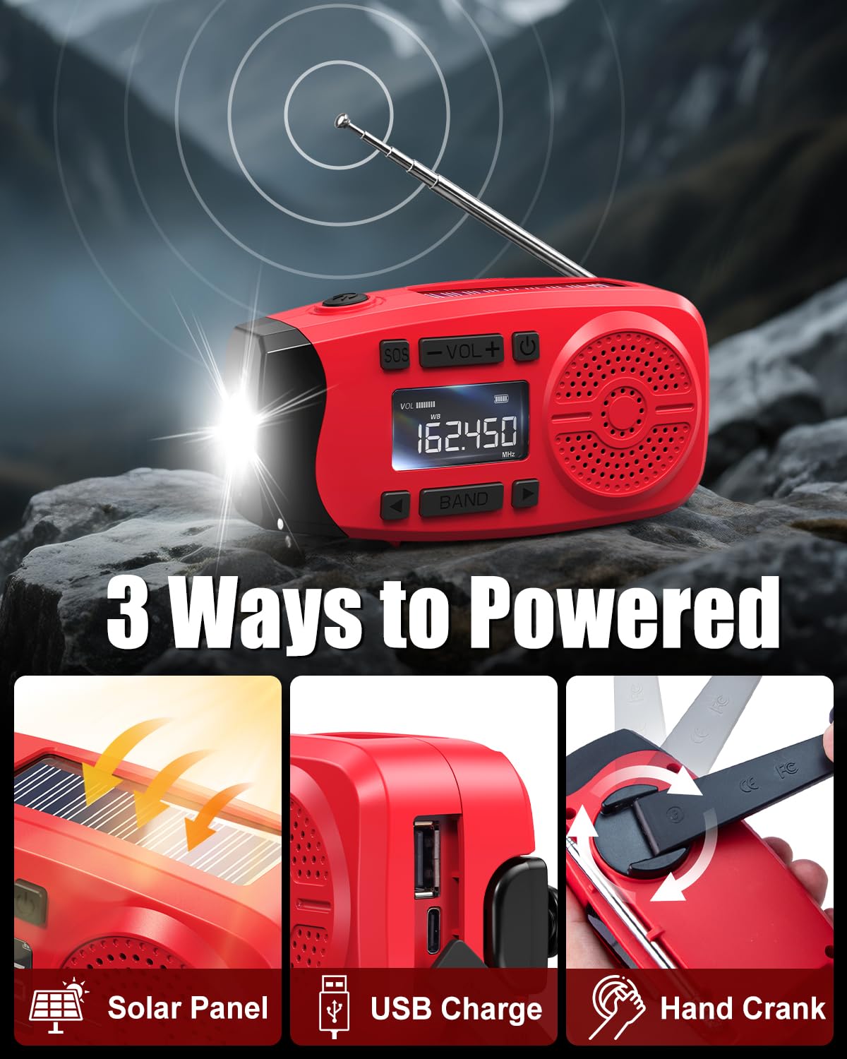 - 【7400mWh Emergency Radio With 3-Charging Way】Equipped with a 7400mWh (2000mAh) battery, this emergency radio could provide emergency power for your cellphone or other USB-powered devices during power outages, hurricanes, or camping. Additionally, this hand crank emergency radio supports USB charge/hand crank/solar power so that you will never worry about running out of power during emergencies. Stay powered sustainably anywhere.