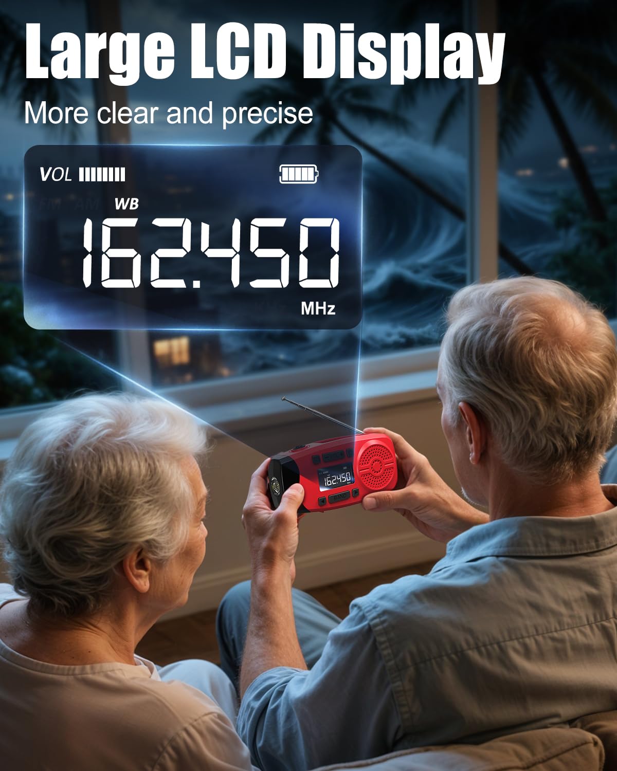 - 【Emergency Radio with LCD Display】Differernt from the other emergency radios, this emergency weather radio with the HD LCD easily shows the battery level and current tuning frequency, which can provide reliable AM/FM/WB reception and accurately pick your favorite channel. Easy to read and use day or night, indoors or outside.
