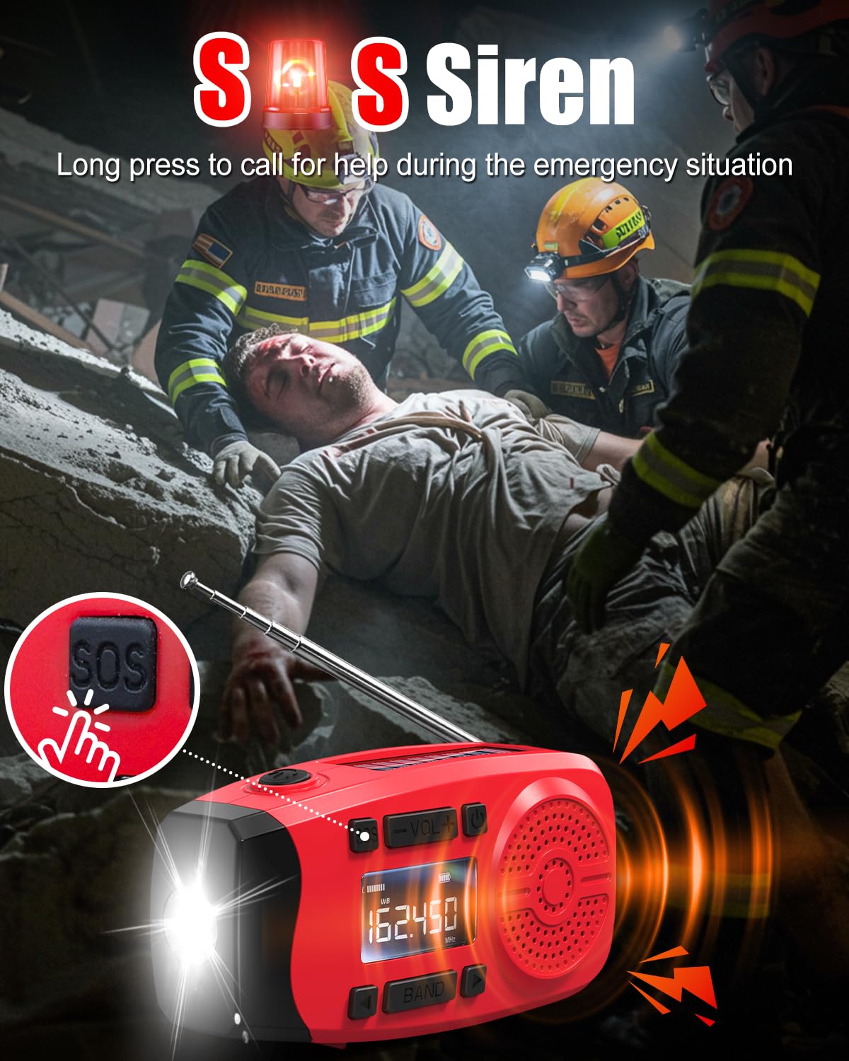 - 【Ultra-Bright Flashlight & SOS Siren】this hand crank emergency radio with a super-bright LED flashlight and a loud SOS siren, which could increase the chances of survival. Activate the SOS alarm for a piercing, high-decibel siren and flashing light to signal rescue teams during critical emergencies. The built-in super-bright 1W LED flashlight provides superior and long-range illumination for safe navigation. Light up your darkness!