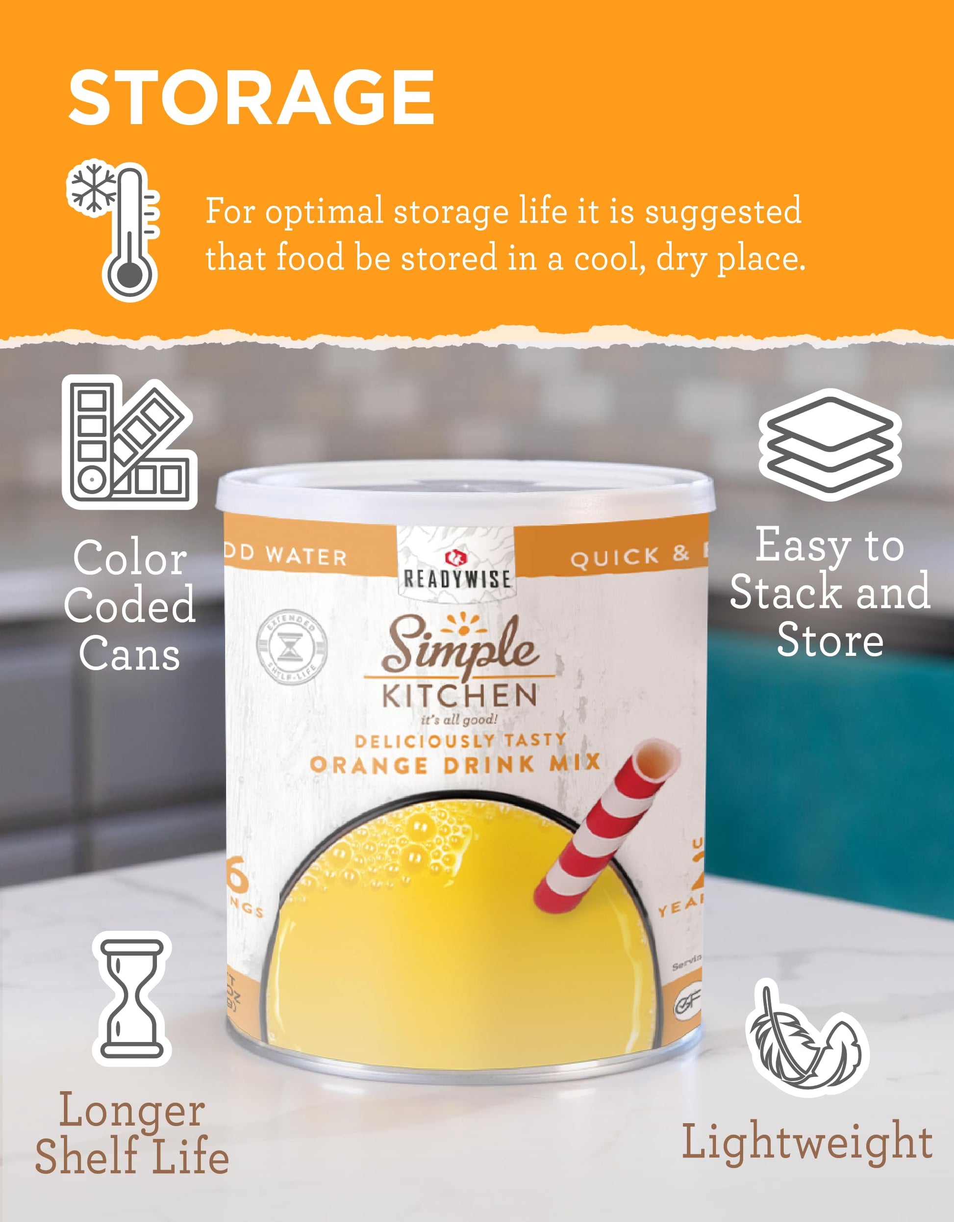 - LONG TERM STORAGE: Count on the longevity of your Simple Kitchen & Emergency Supplies, because our durable and stackable cans are built to keep your Orange Powder Drink Mix beverages fresh and ready for drinking with up to 25 year shelf life.