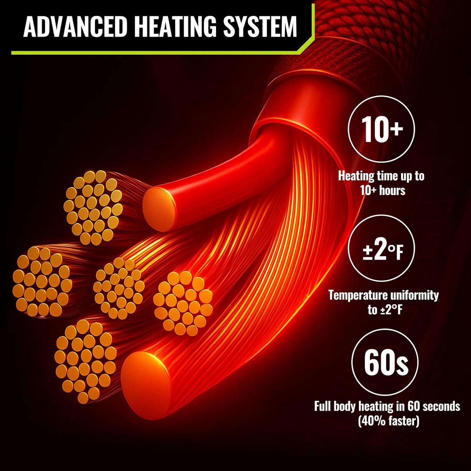 - 【Advanced Heating System】 Upgraded heating strips , achieving full-body warmth in 60 seconds (40% faster) and ±2°F temperature uniformity. The 10,000mAh power bank supports 10-hour runtime for professional outdoor scenarios: hunting, ice fishing, ice hockey, snowmobile, motorcycling, camping, mountain climbing, hiking and even doing outdoor work.