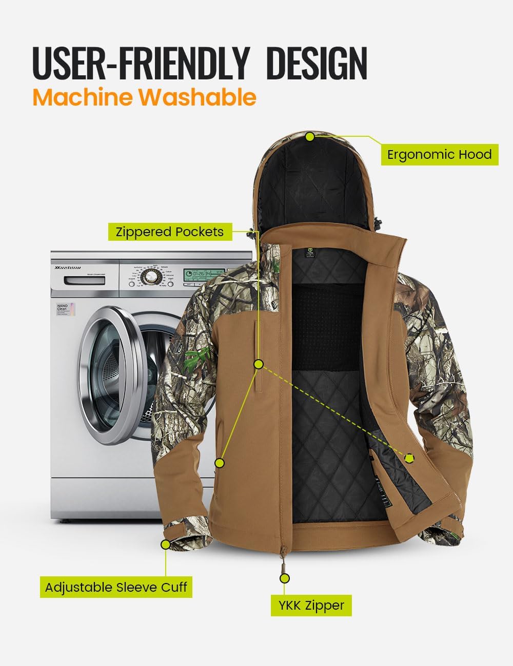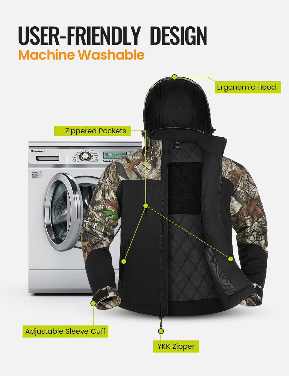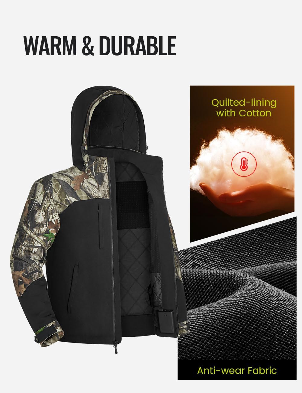 - User Friendly Design: A portable power bank with 2 USB ports is offered, with which you can heat your winter jacket and charge your phone at the same time. The adjustable cuff and customized hood and high-quality YKK zippers are designed to protect you from the cold and wind. Our jacket design is also machine washable in order to clean the product when necessary