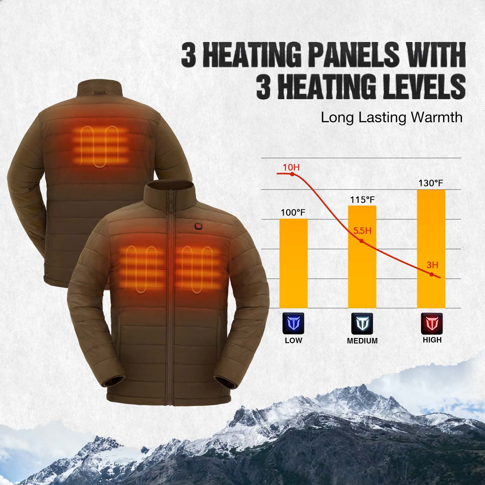 - 【Long-Lasting Warmth & Safety】TIDEWE heated jackets feature 3 adjustable heat settings, which makes it easy for you to adjust the temperature according to your needs. Jackets can be fully charged in 3-4 hours; quick charge is only 2 hours. Up to 10 working hours on the lowest setting, 5.5 hours on medium, 3 hours on high. The jacket applies the battery with UL, FCC, RoHS, CE certification. keep you warm and safe at the same time.