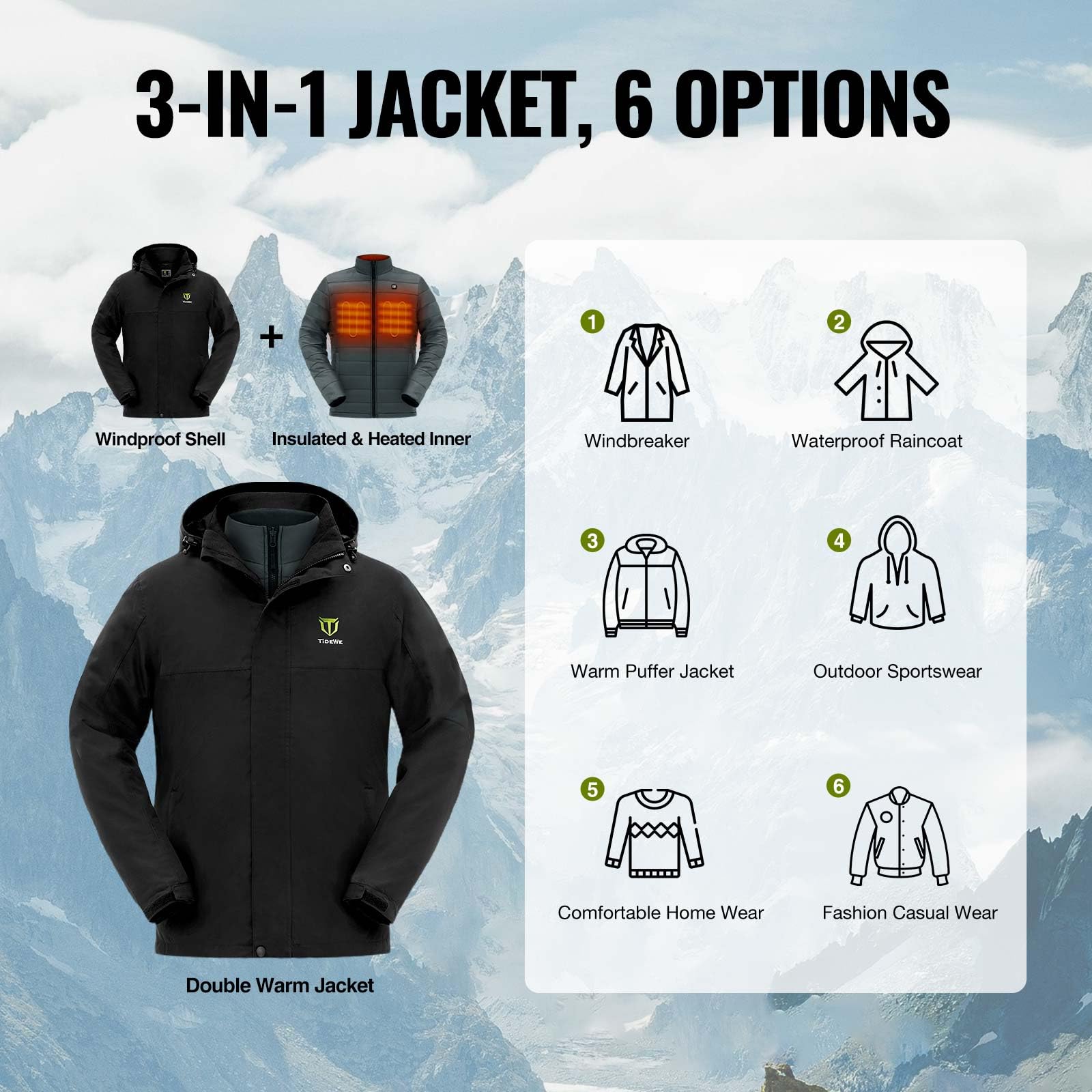 - 【Versatile 3-in-1 Design】TIDEWE 3-in-1 heated jacket is designed for all weather conditions. You can wear the hooded waterproof shell and the inner heated clothing on their own or together. The inner fleece with 120g insulation liner provides you great comfort and warmth in cold weather. The waterproof and windproof soft shell is lightweight, perfect for your outdoor activities. The inner fleece together with the shell enable you stay warm and dry.