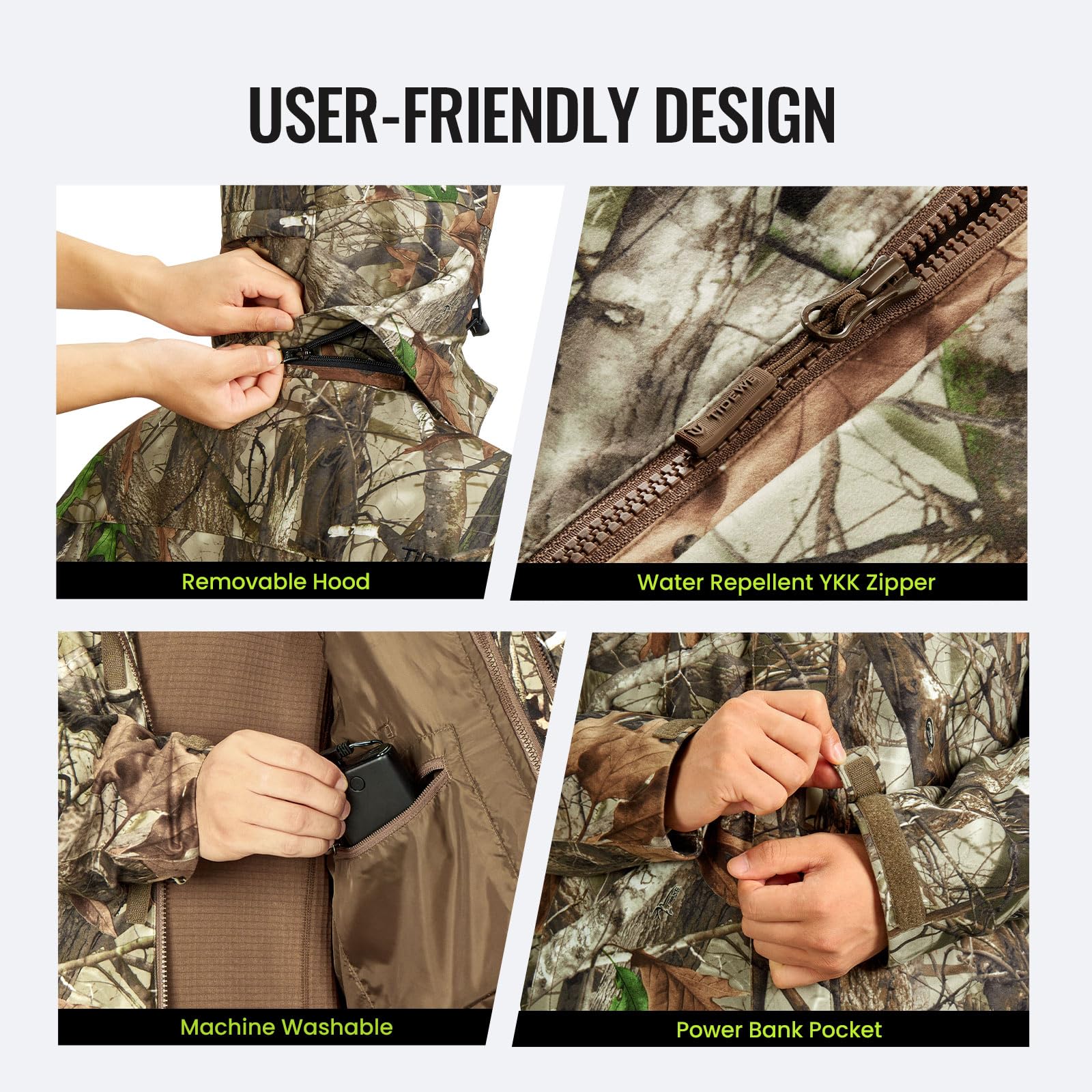 - 【100% Waterproof】Our 3-in-1 jackets are made of insulated fleece, water repellent (DWR) and windproof material. The sealed seams ensures 100% waterproofing for the shell. The hardened brim design keeps rain and snow out. The TIDEWE heated jacket provides innovative, lasting waterproof protection you can always rely on.