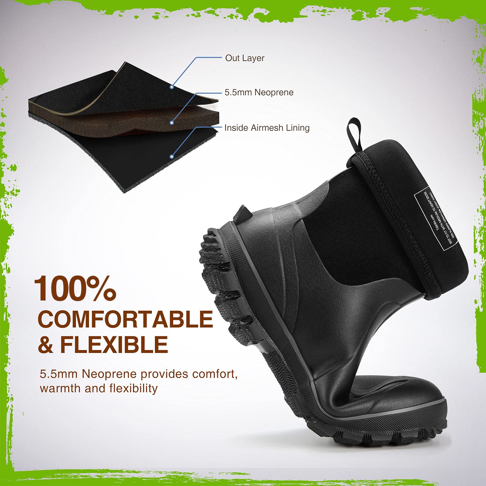 - 【Comfort & Flexibility】 TIDEWE rubber boots features breathable mesh lining, letting your feet remain cool with outstanding air circulation. You do not feel sweaty inside the rubber work boots. 5.5 mm neoprene uppers provides comfort and flexibility, shock absorption and heat retention properties. Comfort rated: -4°F/-20°C to 68°F/ 20°C.