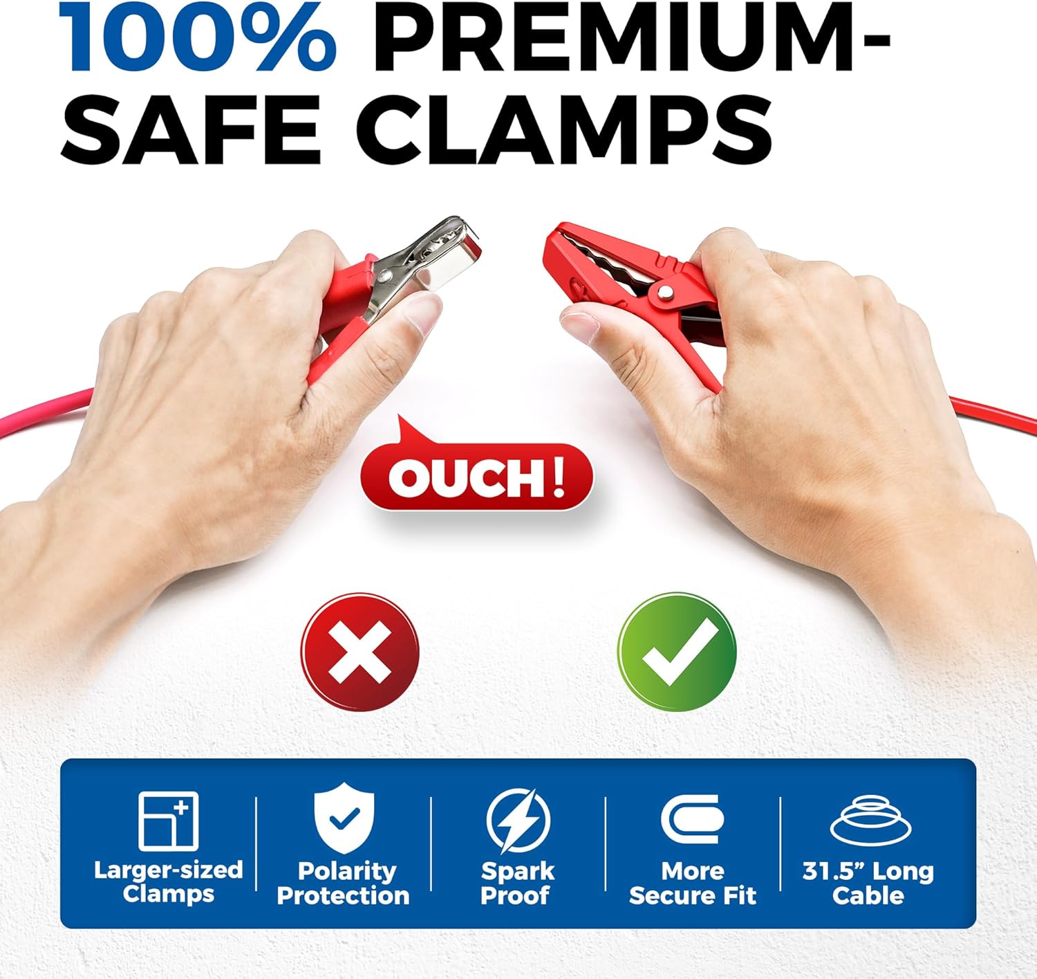 - [Ergonomic Features] To help you rapidly determine the health of the battery, this load battery tester is built with three different colors of LEDs. It's easy to use because it operates through a menu system. Additionally, for a reliable and secure connection during the testing process, premium-quality copper clamps have polarity reverse prevention and spark proof features.