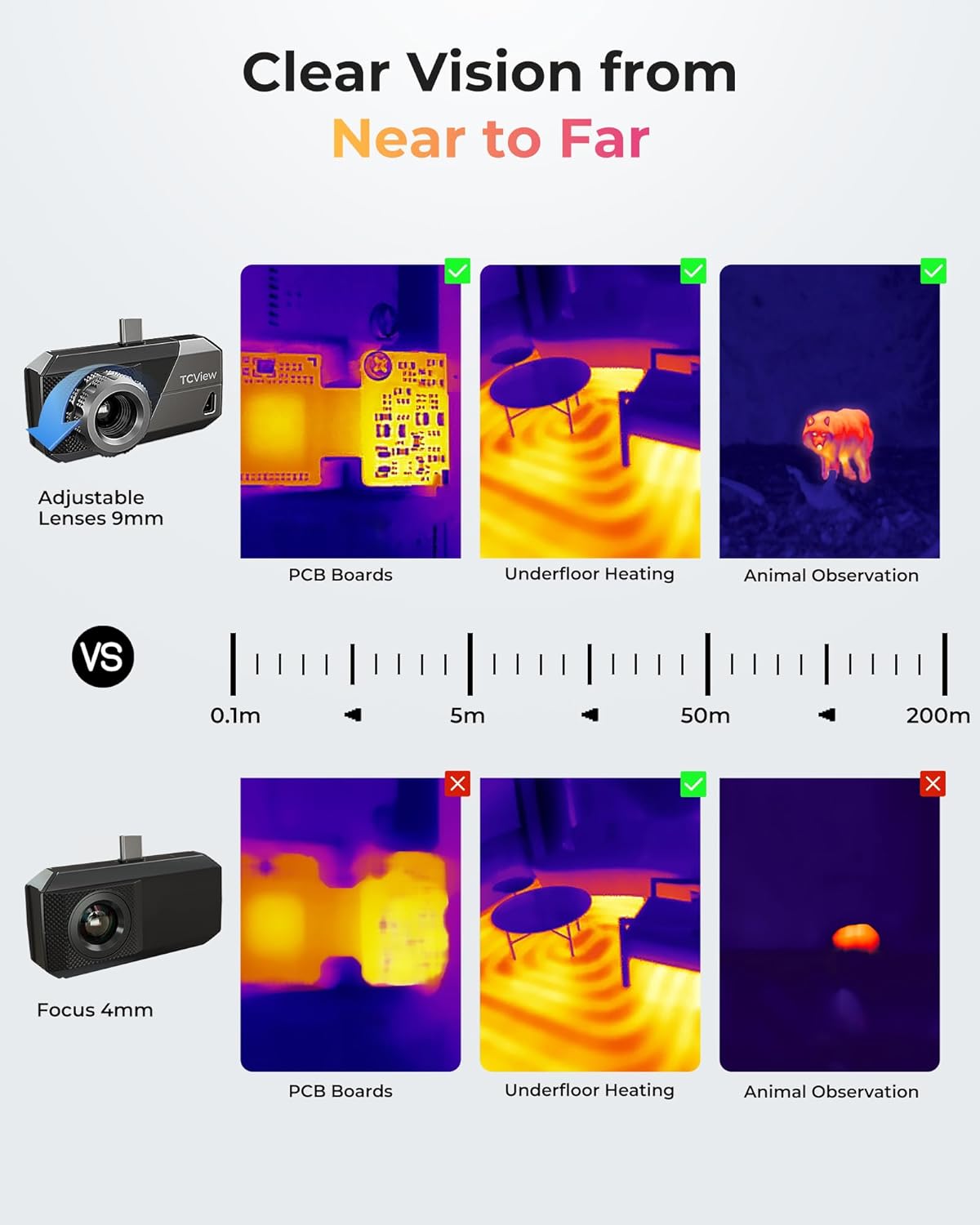 - Superior Image Quality: The TS001 thermal camera boasts superior image quality with 256x192 IR resolution and smooth 25Hz frame rate. The HD camera detects PCB boards, resistors, and other 1mm components without any stress. The adjustable lens caters to infrared imaging requirements spanning distances from 0.1 meters to 500 meters, effectively serving various applications including building inspection, agriculture, forestry, and outdoor tracking.